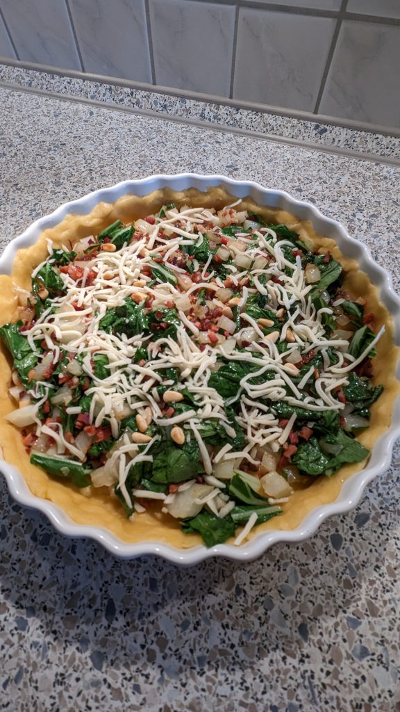 Speck, Mangold-Zwiebel-Mischung und die Hälfte der gerösteten Pinienkerne auf dem Teigboden verteilen, mit der Hälfte des geriebenen Käse bestreuen.