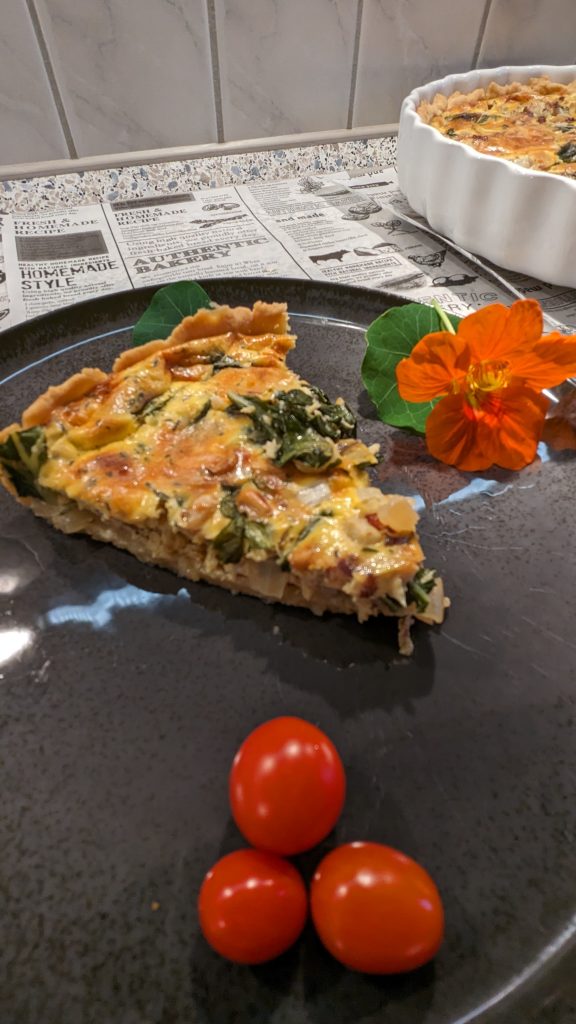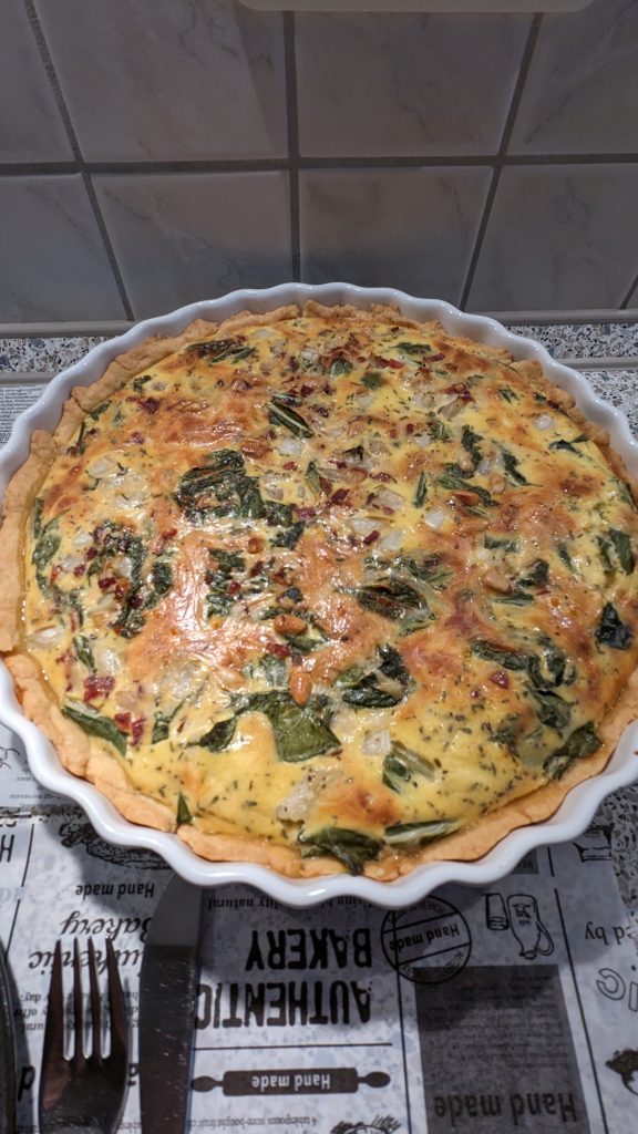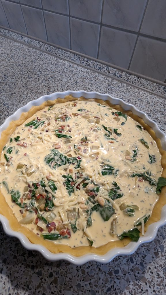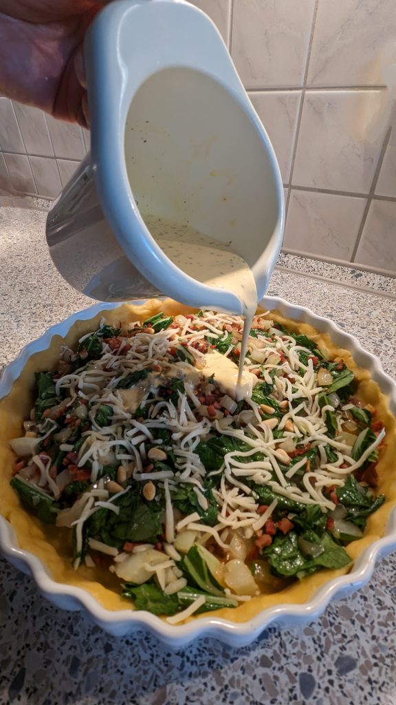 Die Tarte im vorgeheizten Ofen ca. 30-40 Minuten backen, bis der Guss gestockt und die Oberfläche goldbraun ist.