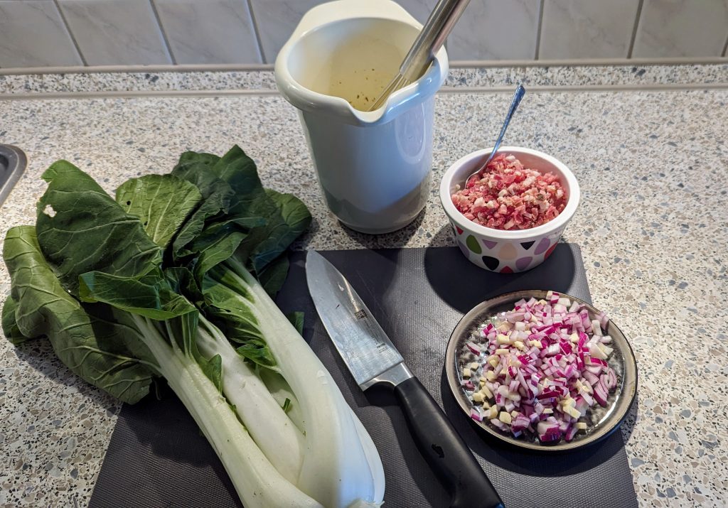 Mangold gründlich waschen, die Stiele in Würfel und die Blätter in Streifen schneiden.
