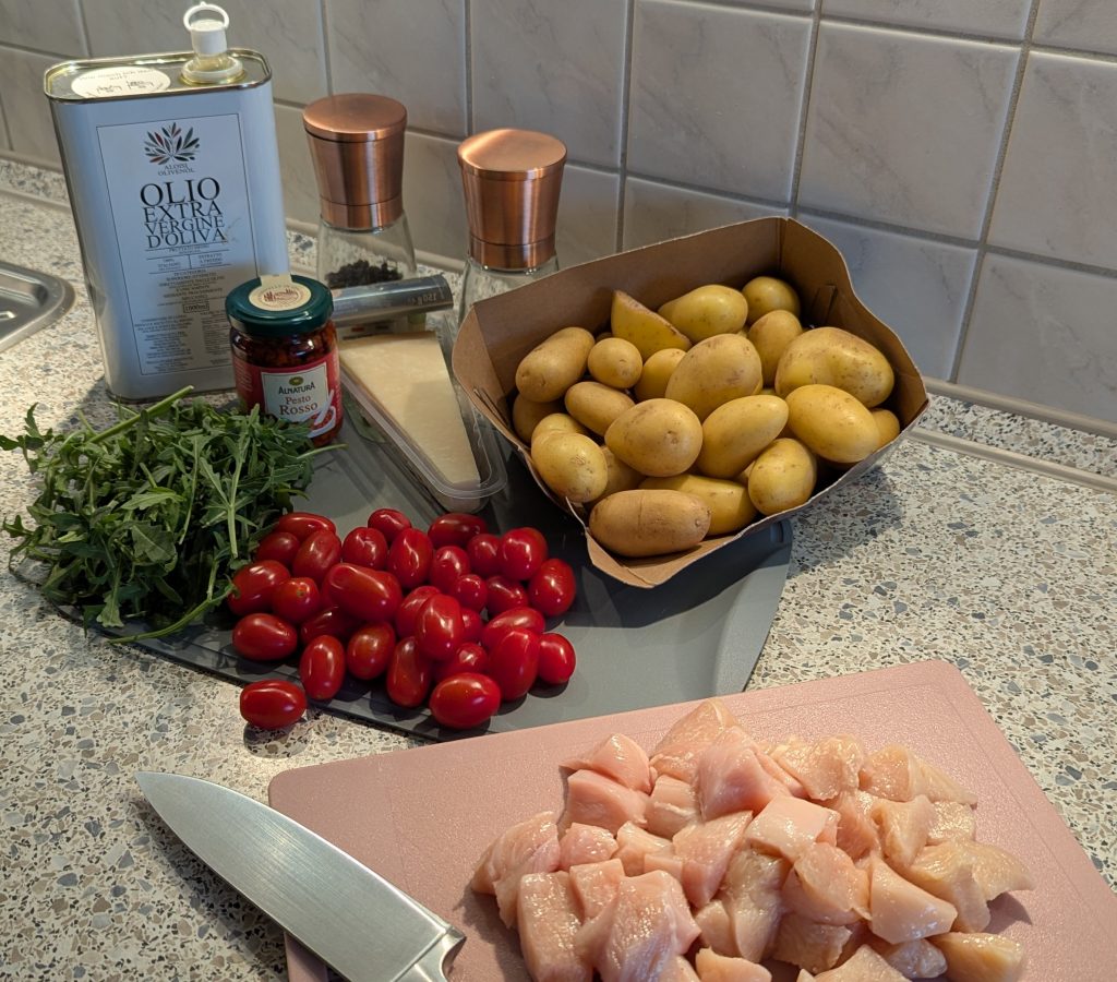 Schneide das Hähnchenfleisch in mundgerechte Stücke oder Streifen. Vermische es in einer Schüssel mit 2 EL des Pestos, einem Schuss Olivenöl und etwas Pfeffer. (Salz vorsichtig dosieren, da Pesto und Parmesan schon salzig sind).