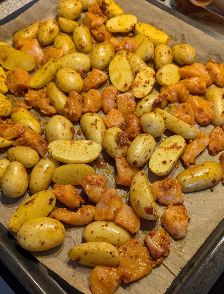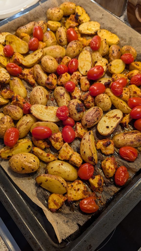 Nimm das Blech kurz aus dem Ofen. Verteile das marinierte Hähnchen zwischen den Kartoffeln. Gib alles für weitere 15-20 Minuten zurück in den Ofen, bis das Hähnchen durchgegart und die Kartoffeln weich sind. 10 Minuten vor Ende die Tomaten darüber verteilen.