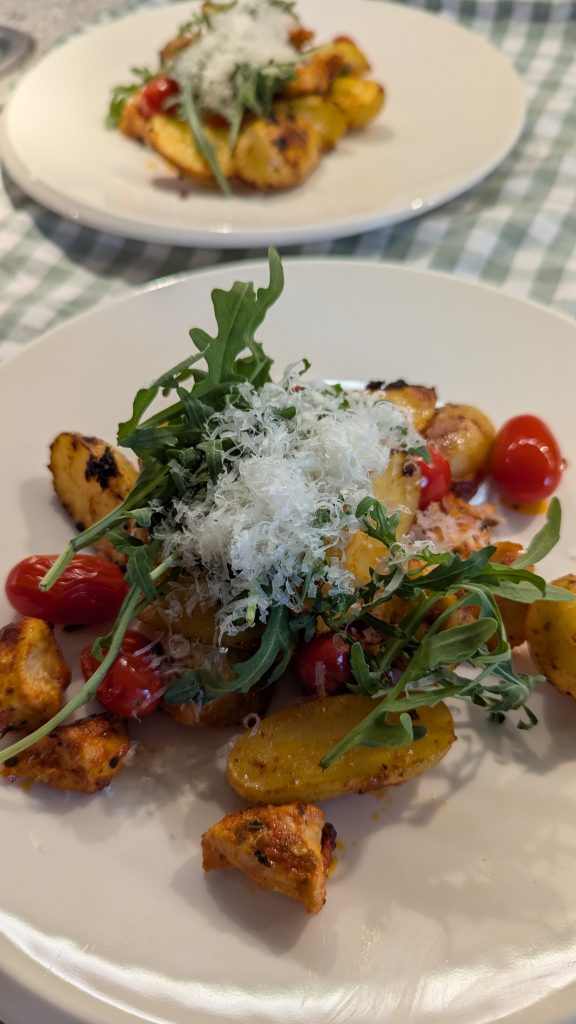 Verteile das Pesto-Hähnchen und die Kartoffeln auf Tellern.