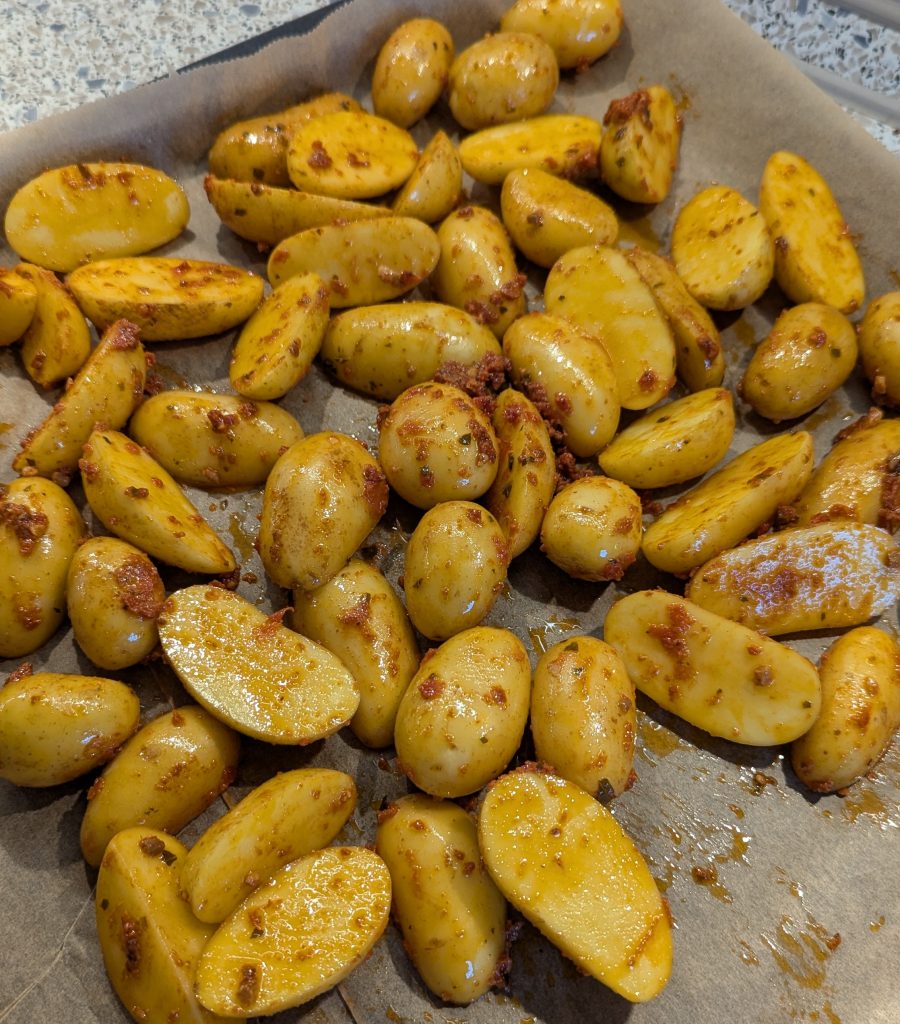 Gib die Kartoffeln in eine Auflaufform oder direkt auf ein mit Backpapier belegtes Blech. Beträufle sie mit 1EL Pesto, 1 EL Olivenöl und einer Prise Salz. Schiebe sie für ca. 15-20 Minuten in den Ofen, da sie länger brauchen als das Fleisch.