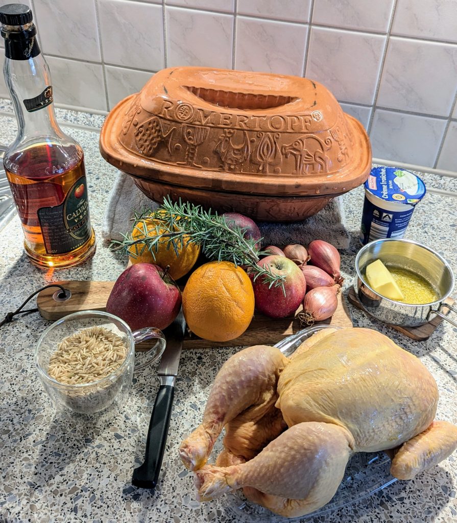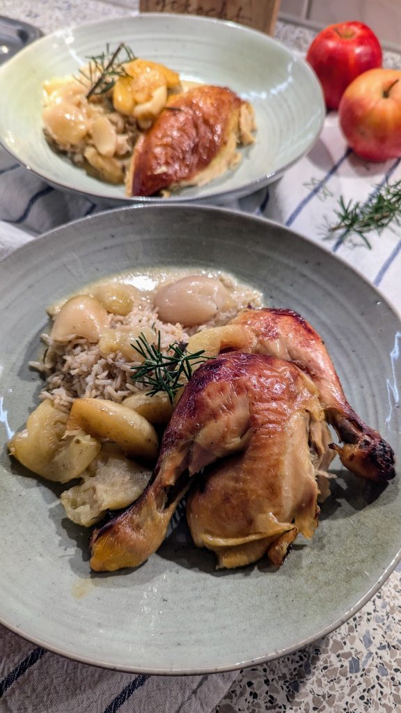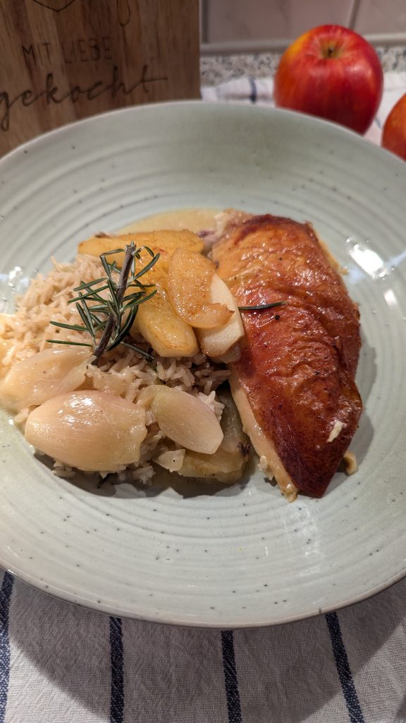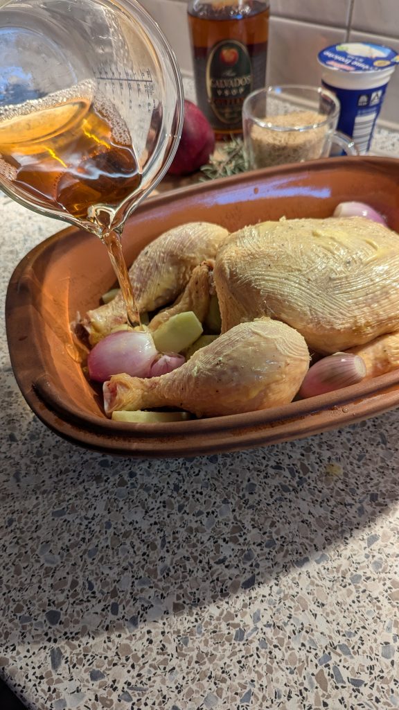 Normannen Hähnchen ist ein klassisches Gericht aus der französischen Region Normandie. Es zeichnet sich aus, durch seinen zarten Geschmack, der durch die süße Note des Calvados und die Würze der Kräuter abgerundet wird. Die Zubereitung im Römertopf ist sehr einfach, es sollte aber auch in einem Bräter funktionieren.