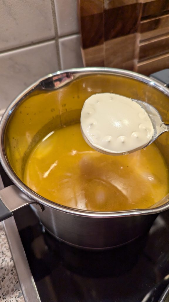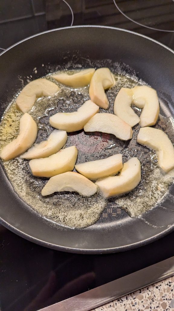 Die Flüssigkeit aus dem Römertopf in einen Topf geben, ca. 5 Minuten einkochen und Creme fraiche zufügen. Den restlichen Apfel in 1 EL Butter kurz anbraten und mit Calvaos ablöschen.