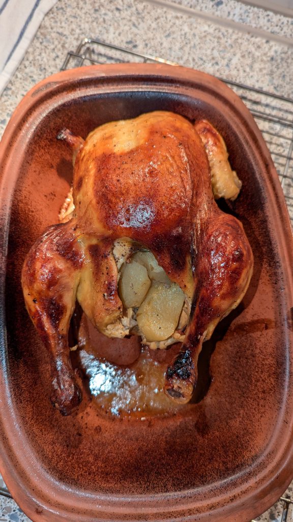 Nach dieser Zeit das Huhn aus dem Römertopf nehmen, auf ein Backblech legen und zurück in den Backofen warm stellen.