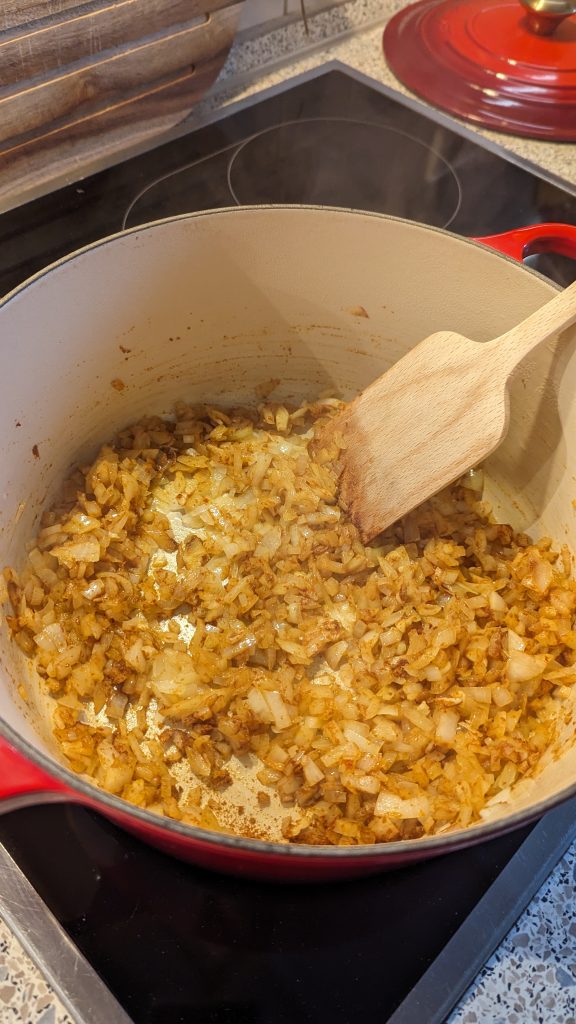 Das Tomatenmark zufügen und unter Rühren kurz mit anbraten. Aufpassen, dass die Zwiebeln nicht zu dunkel werden!