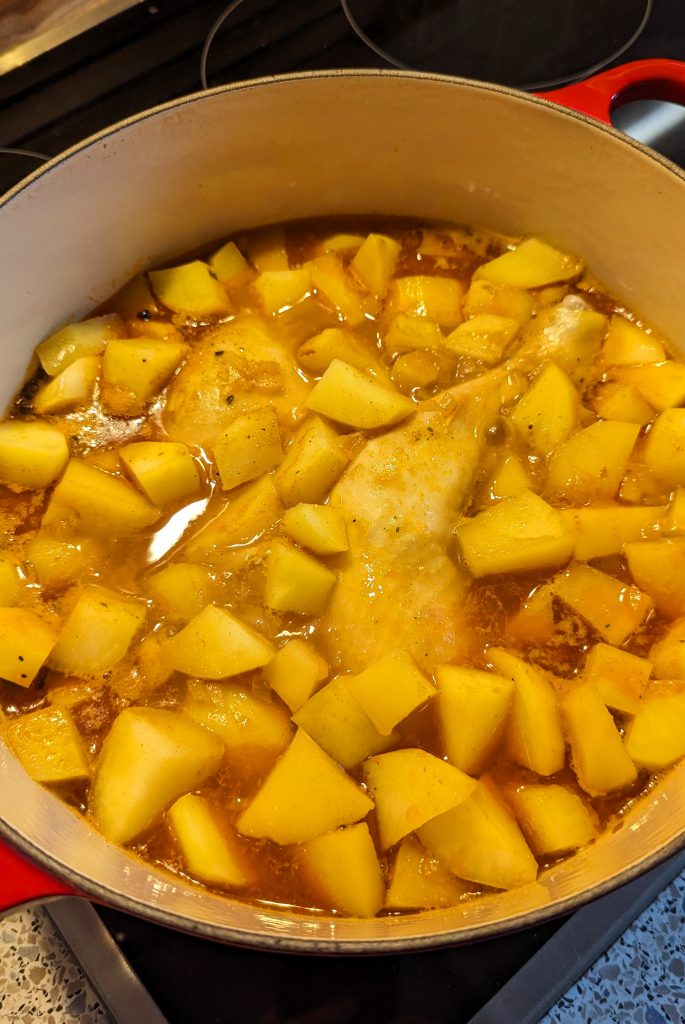 Die Hähncheteile und die Gewürze in den Topf und die Kartoffeln auf die Hähnchenkeulen legen und soviel Gemüsebrühe aufgießen, dass alles knapp bedeckt ist.