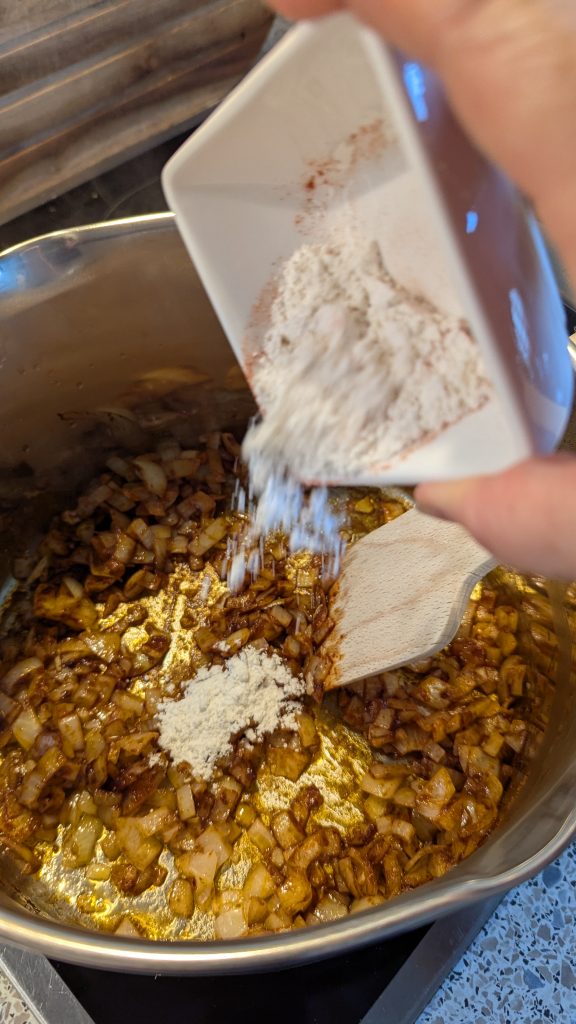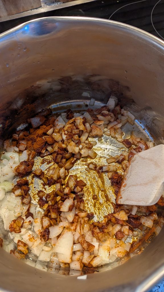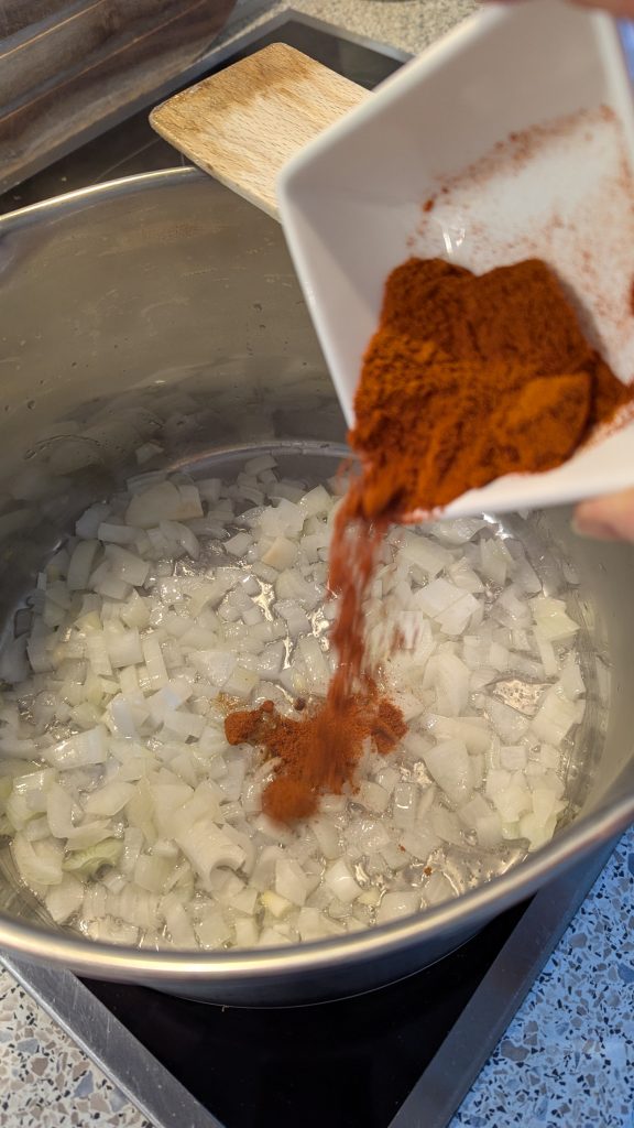 Das Öl in einem grossen Topf erhitzen und die Zwiebeln darin ca. 3Min. glasig dünsten. Paprikapulver dazu geben und alles vermischen und eine weitere Minute anbraten.