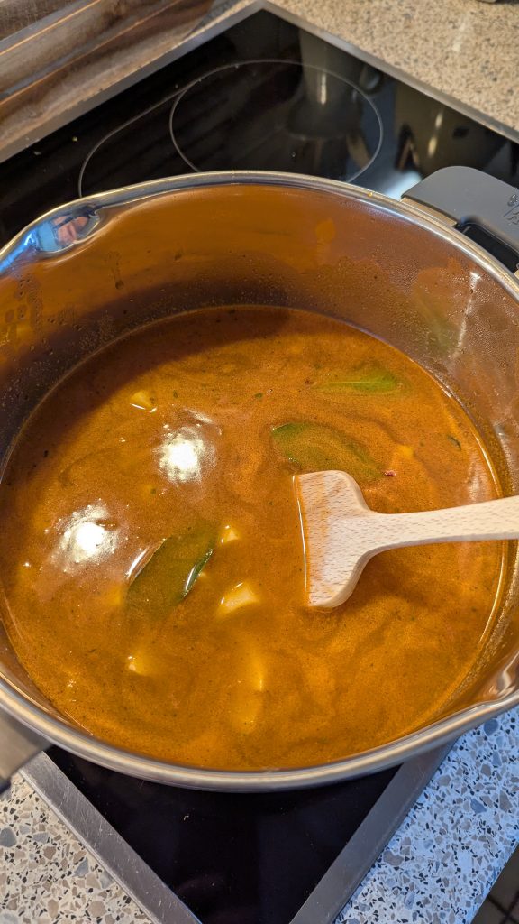 Mit etwas Gemüsebrühe ablöschen und die Kartoffeln zufügen. Weiter Gemüsebrühe dazu geben, bis die Kartoffeln reichlich bedeckt sind.