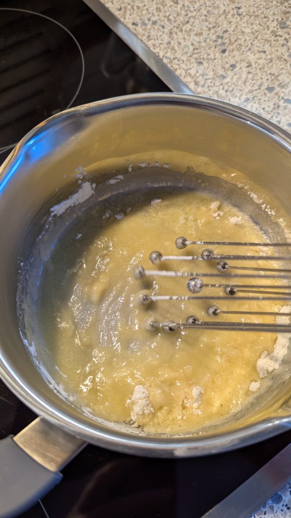 Schmelze die Butter in einem Topf. Rühre das Mehl mit einem Schneebesen ein, bis es leicht schäumt (nicht braun werden lassen!). Nun unter ständigem Rühren nach und nach die Milch und das aufgefangene Kochwasser aufgießen.