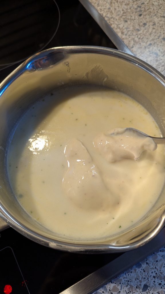 Die Sauce ca. 2 Minuten köcheln lassen, dann den Schmelzkäse unter die heiße Sauce rühren,