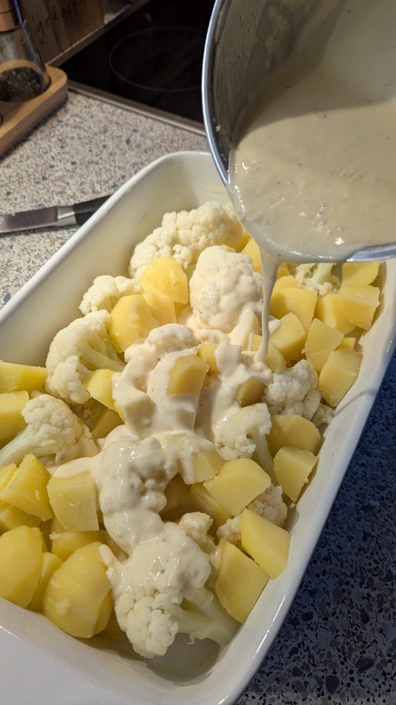 Den Backofen auf 200°C Ober-/Unterhitze vorheizen. Gib die Kartoffeln und den Blumenkohl in eine gefettete Auflaufform und verteile die Sauce gleichmäßig darüber.