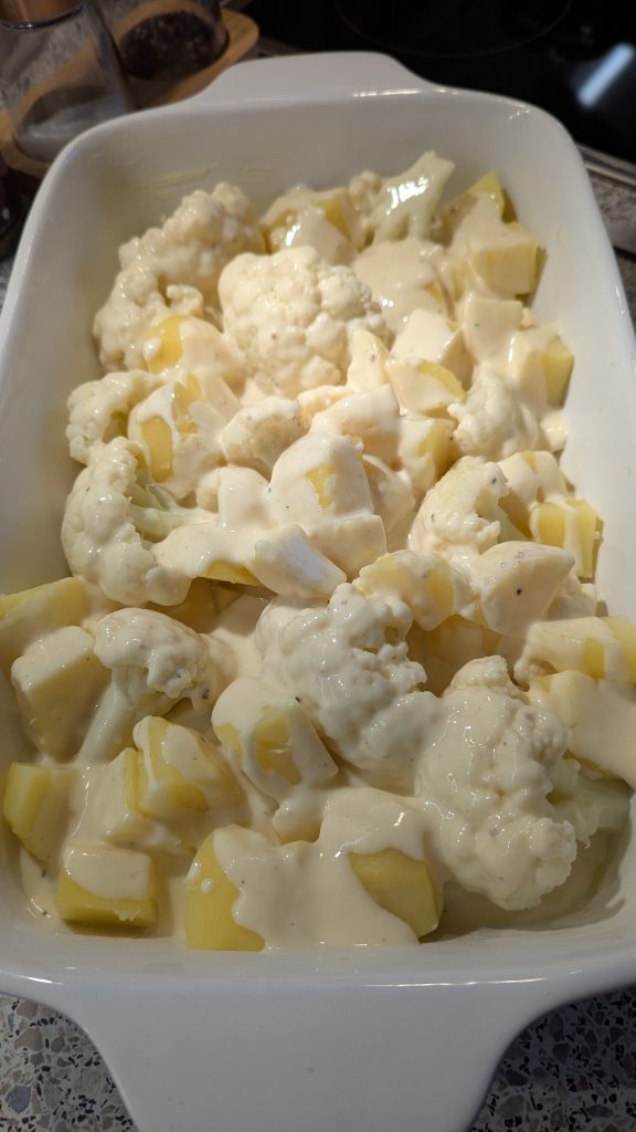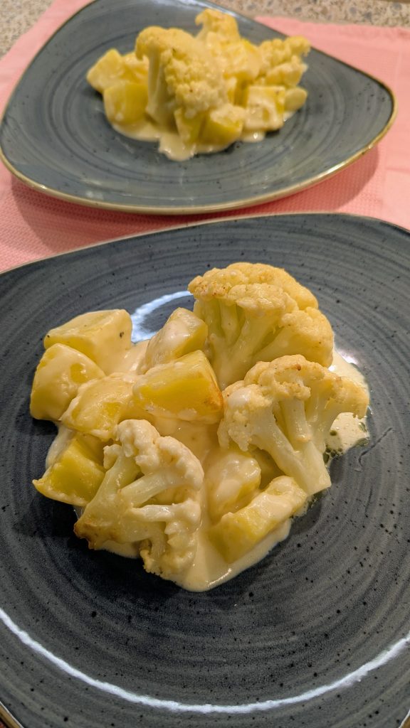Zuerst den Blumenkohl in Röschen teilen und die Kartoffeln schälen und in ca. 2 cm große Würfel schneiden. Beides in gesalzenem Wasser etwa 10–12 Minuten vorkochen. Es sollte bissfest sein, da es im Ofen nachgart.