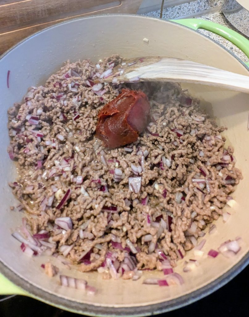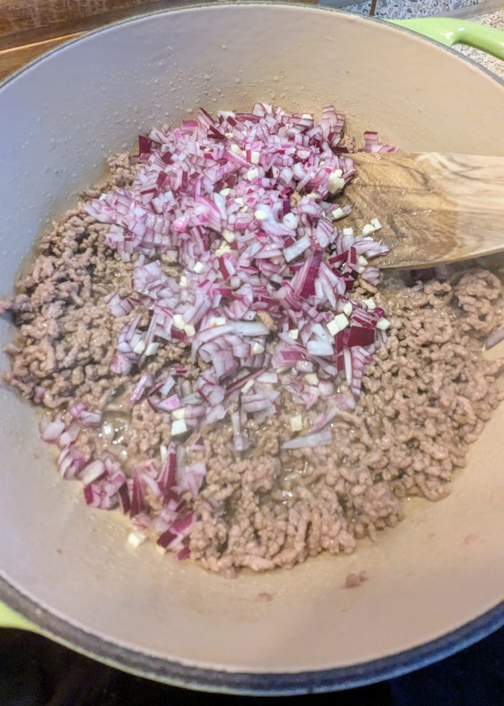 Erhitze etwas Olivenöl in einem großen Topf. Das Hackfleisch darin krümelig anbraten.