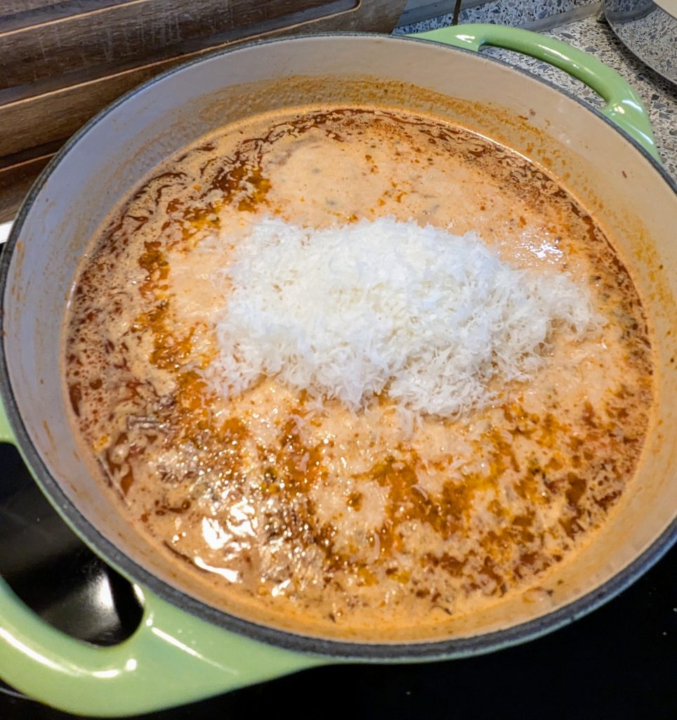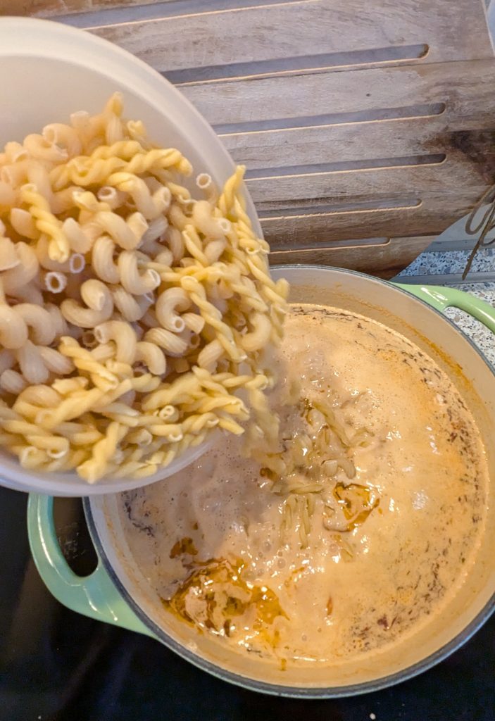 Oregano, Thymian Salz, Pfeffer, Paprikapulver und Chiliflocken darunter mischen und mit der Gemüsebrühe aufgießen. Kurz aufkochen lassen, die Speisestärke in Wasser glatt rühren und in den Topf geben. Sahne zufügen und noch einmal alles zusammen kurz aufkochen. Die Soße noch einmal abschmecken – es soll würzig sein, da die Nudeln etwas vom Geschmack nehmen! Die rohen Nudeln darunter mischen.