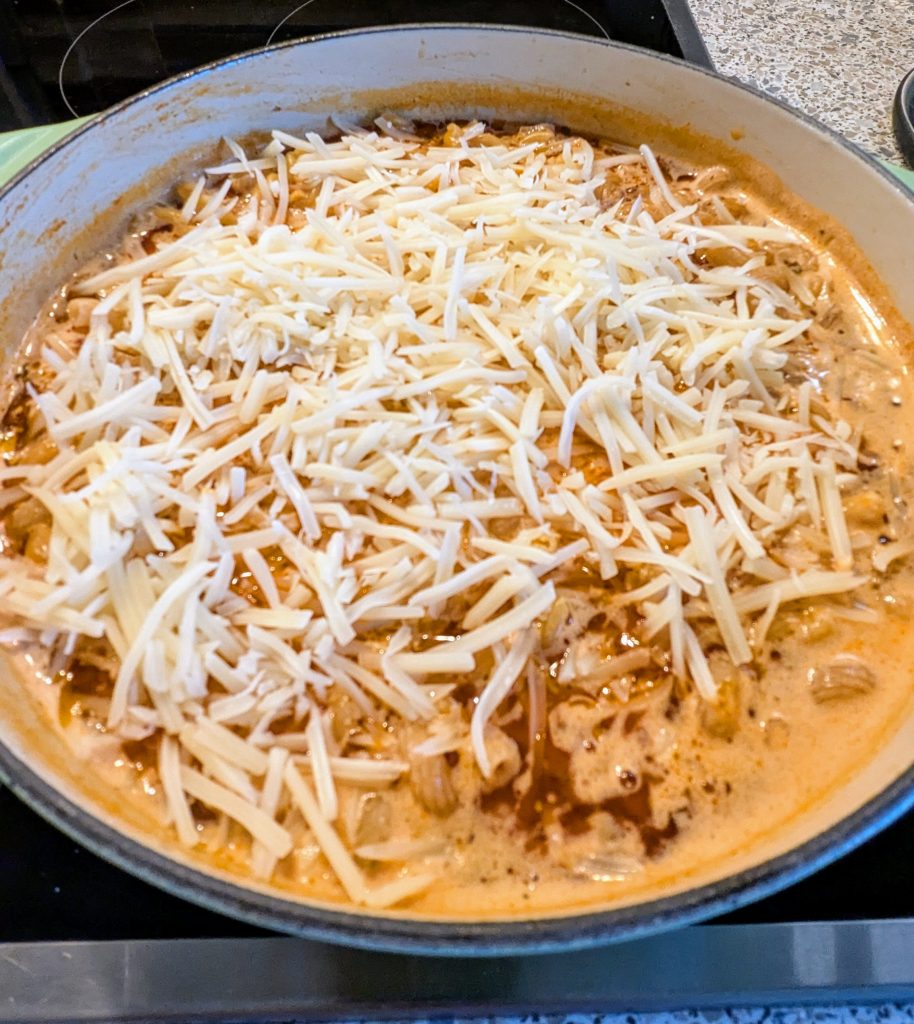 Mit geriebenem Käse bestreuen und für ca. 30 Minuten bei 180° in den Backofen.