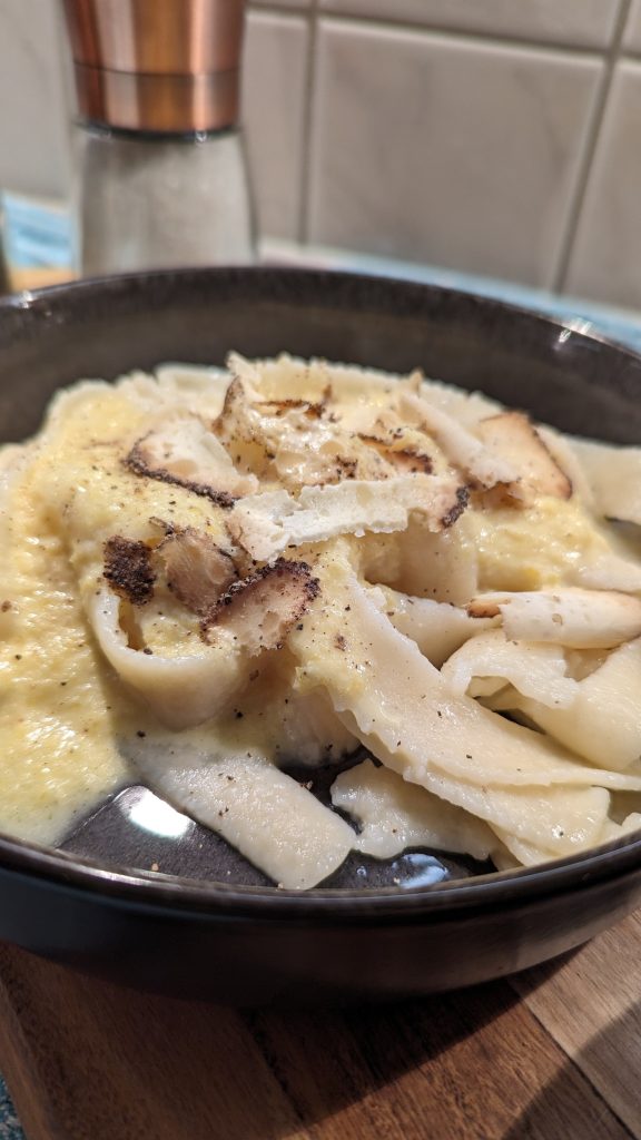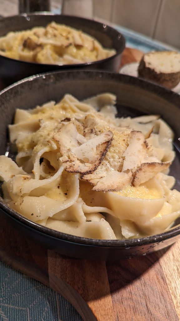 Die Pasta auf einem Teller mit dem Paprikaschaum anrichten und die Belper Knolle über die Pasta hobeln.