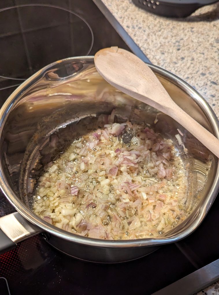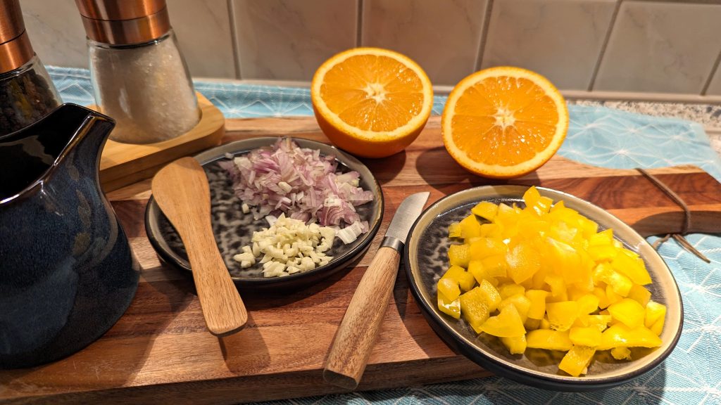 Schalotte und Knoblauch schälen und klein würfeln, Paprika waschen, vom Kernhaus befreien und ebenso klein würfeln.