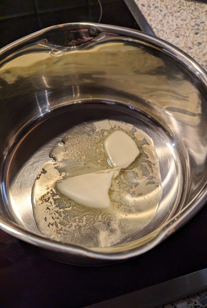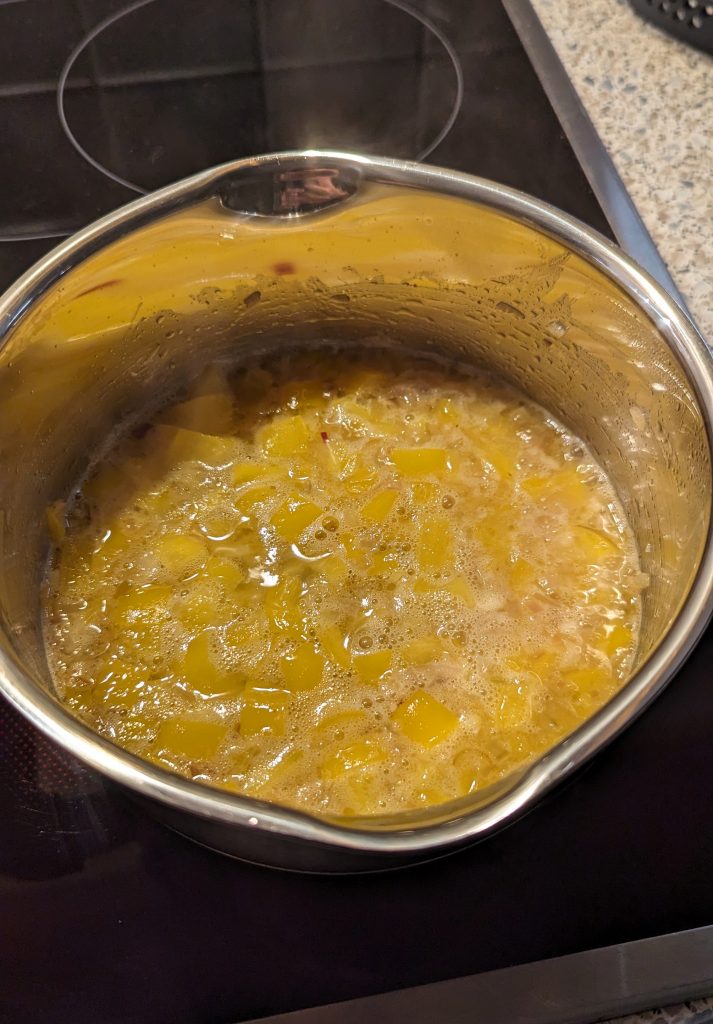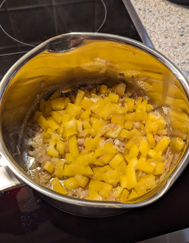 Butter in einem Topf schmelzen, Schalotten, Knoblauch, eine Priese Zucker und Paprikawürfel zugeben und ca. 5 Minuten sanft glasig dünsten.