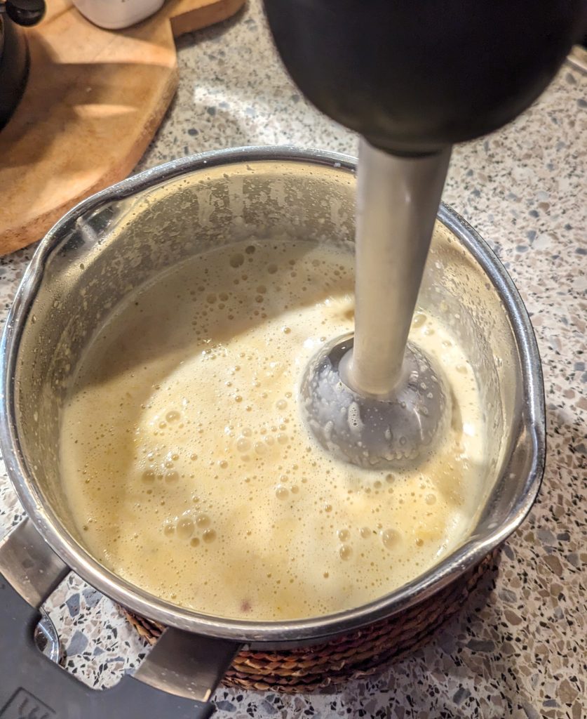 Sahne, Salz und Pfeffer zugeben und noch einmal erwärmen. Mit dem Zauberstab alles fein pürieren und die Sauce schaumig schlagen.