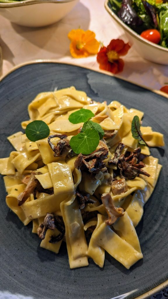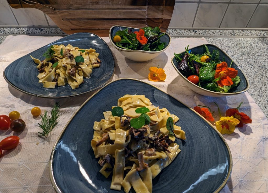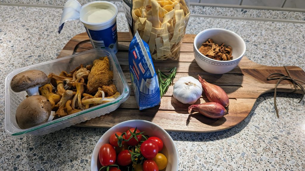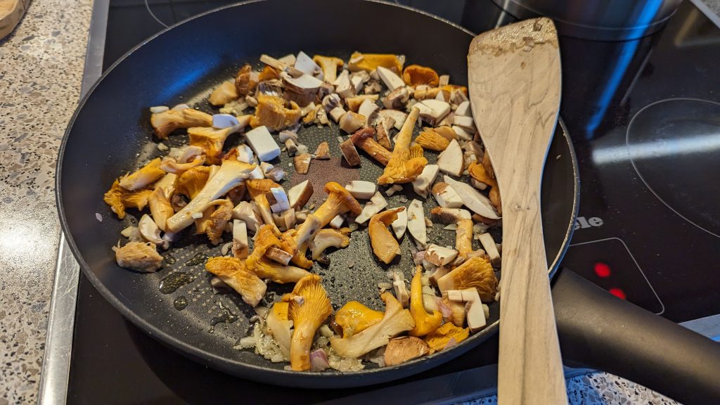 Nudeln in kochendem Salzwasser nach Packungsangaben kochen. Die frischen Pfifferlinge gut reinigen und die grösseren Pilze halbieren oder vierteln. Zwiebeln + Knoblauch in kleine Würfel schneiden. Butter in eine heisse Pfanne geben und Zwiebeln glasig dünsten, dann den Knoblauch zugeben. Eingeweichte Pfifferlinge durch ein feines Sieb abgiessen und Flüssigkeit aufheben. Frische und eingeweichte Pilze in die Pfanne geben und 2 Minuten braten.
