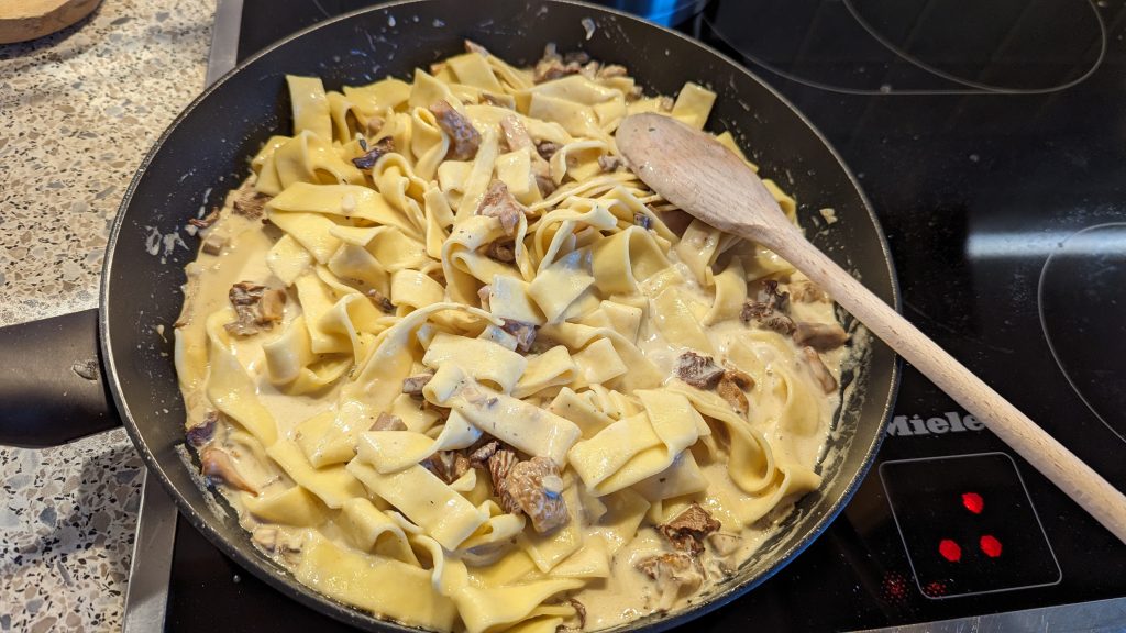 Mit dem Einweichwasser aufgiessen und je nach Geschmack auch ein Schluck Weisswein dazu und zum Kochen bringen. Hitze reduzieren und Crème fraiche und Sahne zufügen. Auf kleiner Flamme kochen, mit Salz, Pfeffer, Chili-flocken, Muskatnuss und Rosmarin abschmecken.