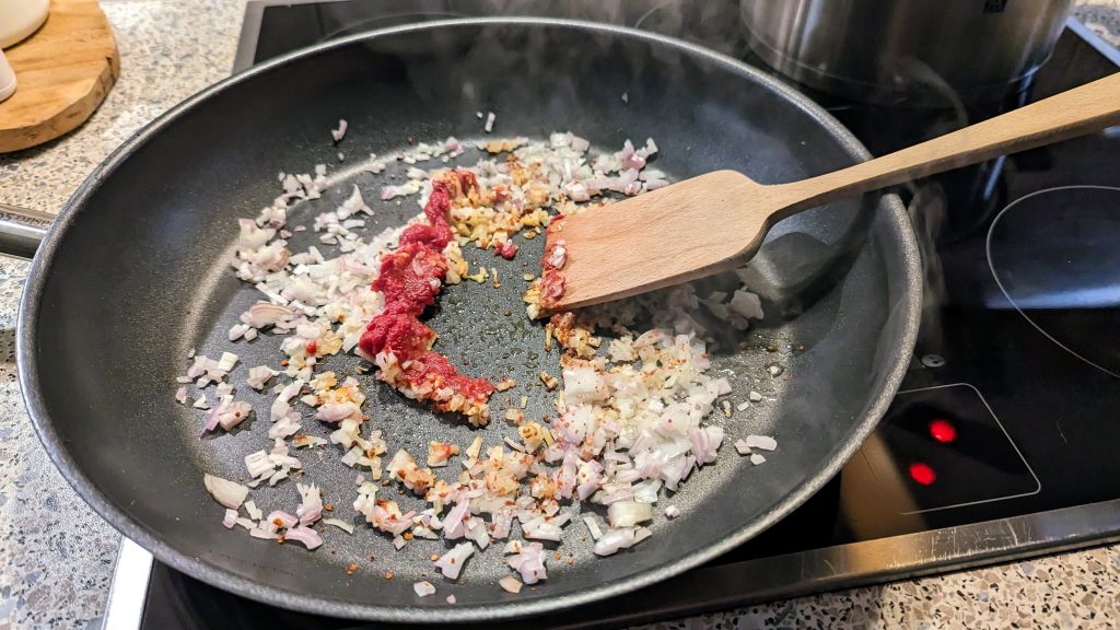 Schalotten und Knoblauch schälen und in kleine Würfel schneiden. Öl in einer großen Pfanne erhitzen und darin Schalotten und Knoblauch anschwitzen. Chiliflocken und Tomatenmark dazu geben und mit 1/2 TL Zucker karamellisieren. Mit dem Vodka ablöschen und kurz einköcheln lassen, bis der Alkohol verflogen ist.