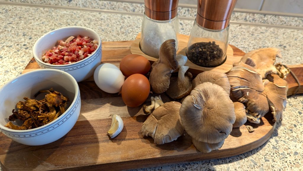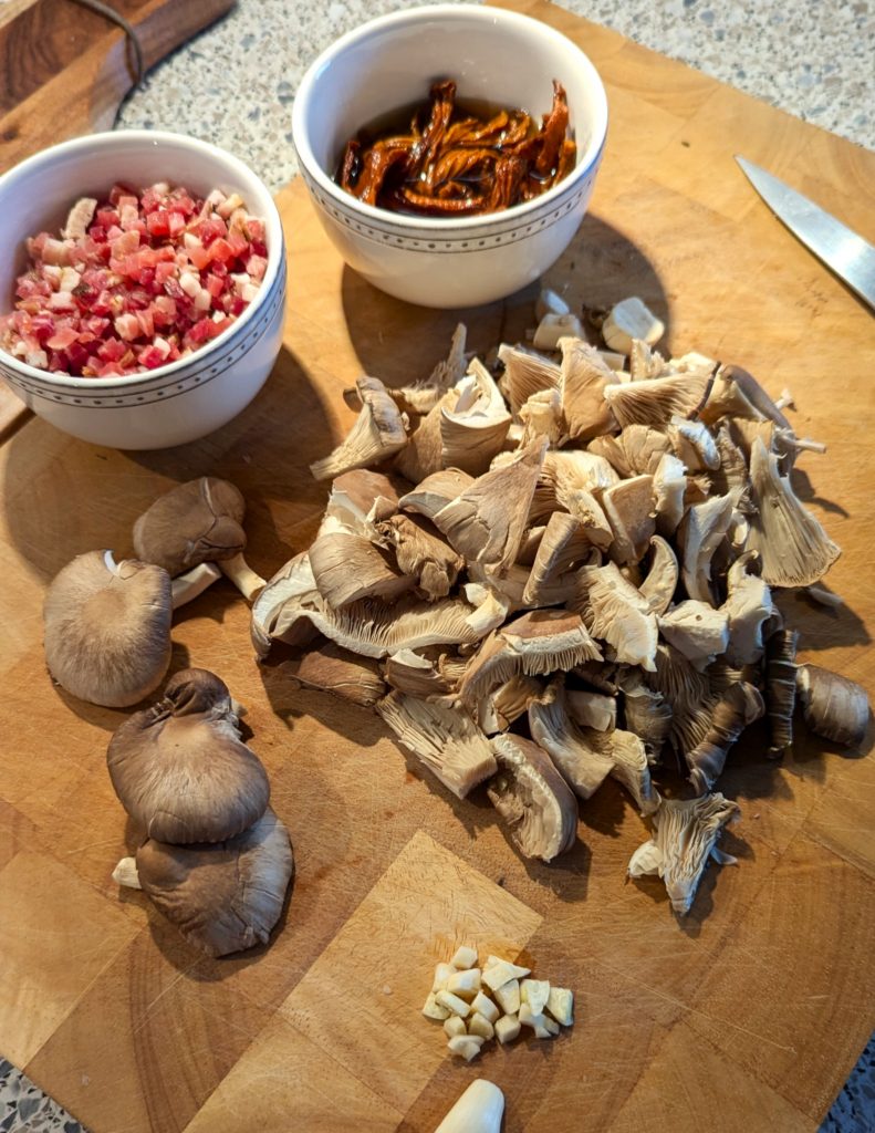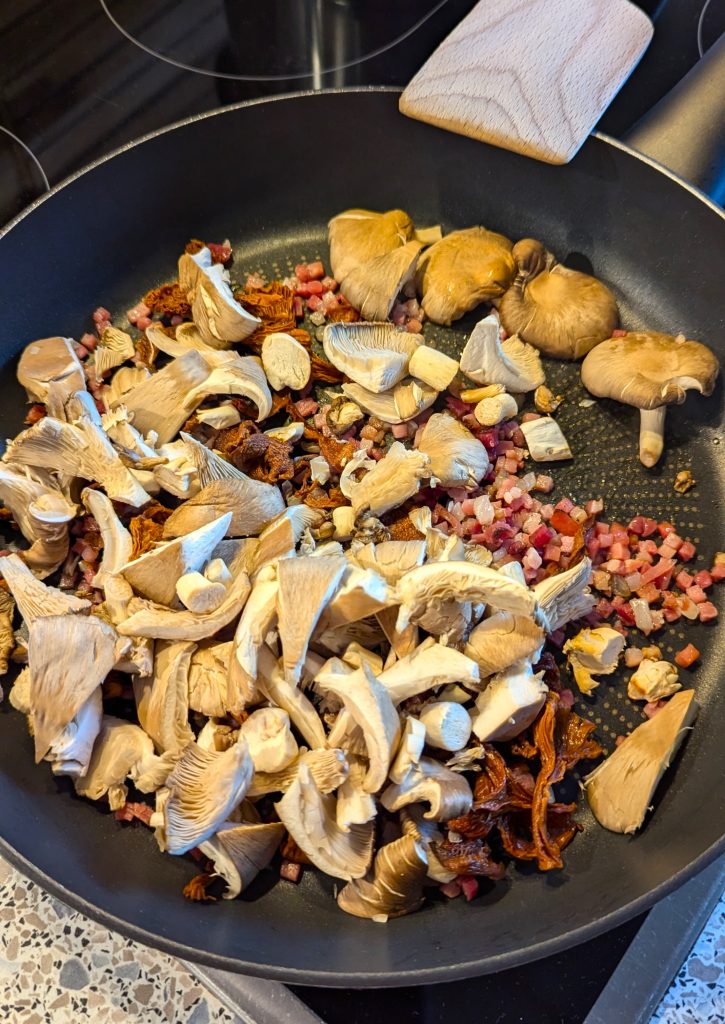 - 200 g Pilze (wir hatten Austernpilze und getrocknete Pfifferlinge)