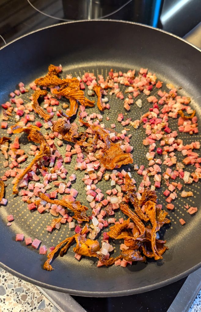 Eine große Pfanne auf dem Herd erhitzen und ohne Zugabe von Fett den Speck darin langsam anbraten. Die Pilze dazu geben und alles gut vermengen. (die eingeweichten Pilze abgießen und klein schneiden) Alles zusammen ca. 3-4 Minuten kross braten. Knoblauch schälen, klein würfeln und unter die Pilzmischung rühren.