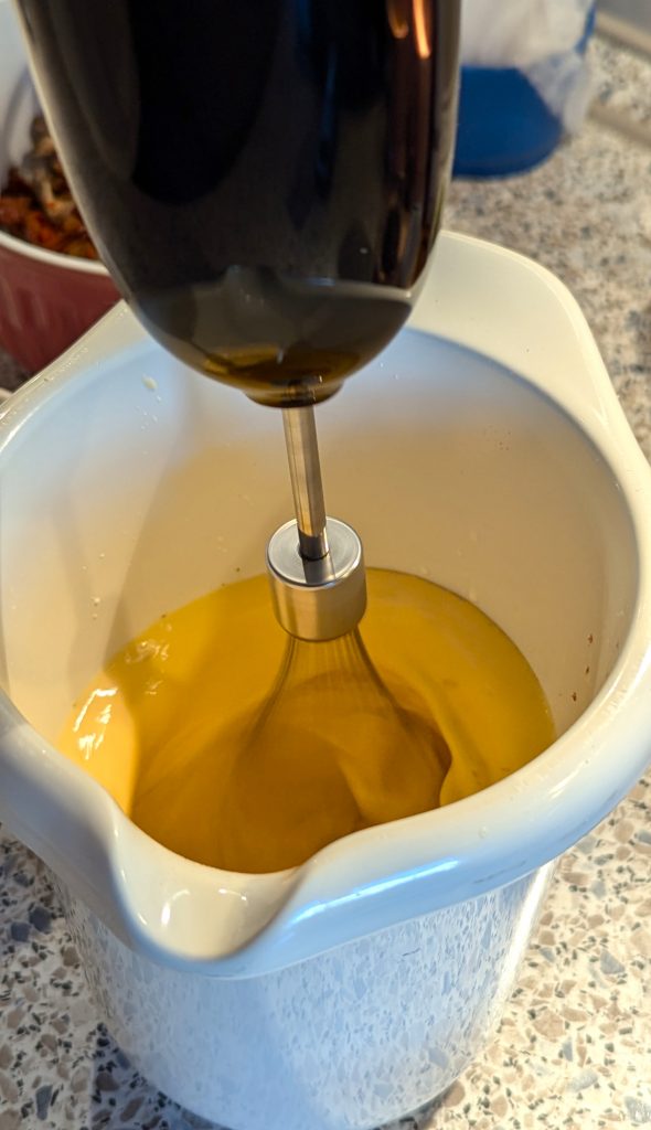 Eier, zusammen mit Sahne, Salz, Pfeffer, einer guten Priese frisch geriebener Muskatnuss in einem Gefäß verquirlen.