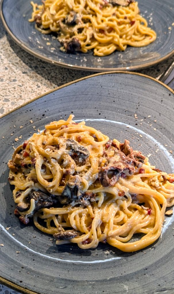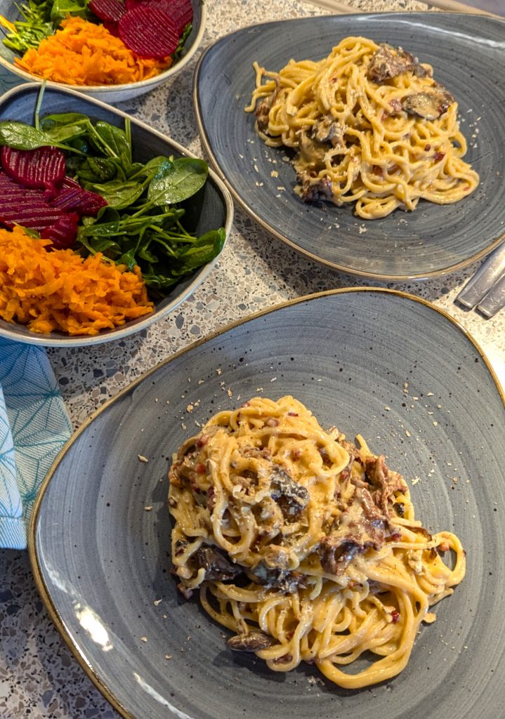 Die klassische Carbonara ist ein italienisches Gericht mit Eiern, Pecorino Romano und Guanciale (gesalzener Schweinebacke). Die Pilz-Carbonara ist eine vegetarische Variante, die den herzhaften Geschmack beibehält, aber auf tierische Produkte verzichtet.