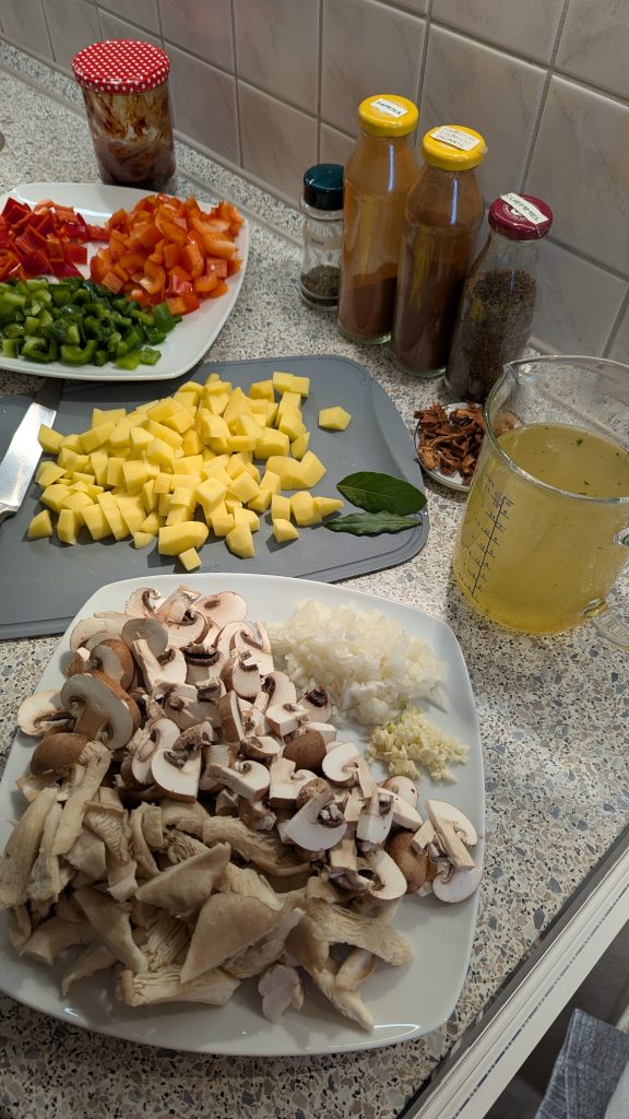 Die Pilze putzen (nicht waschen!) und in mundgerechte Stücke schneiden. Kartoffeln schälen und würfeln. Paprika entkernen und ebenfalls in Würfel schneiden. Zwiebeln und Knoblauch fein hacken.