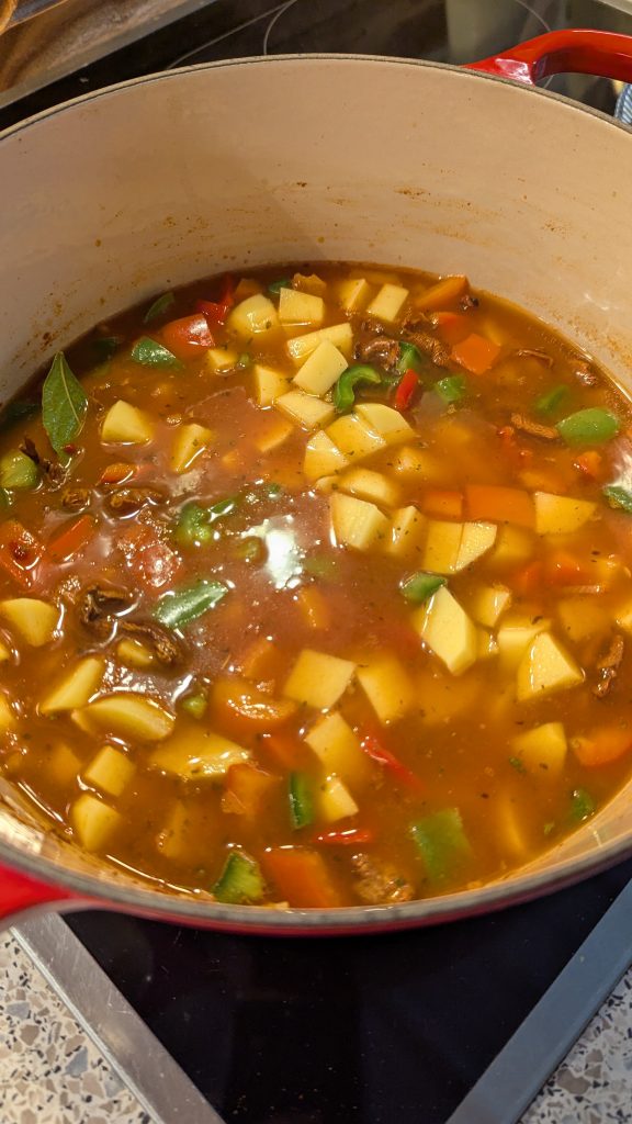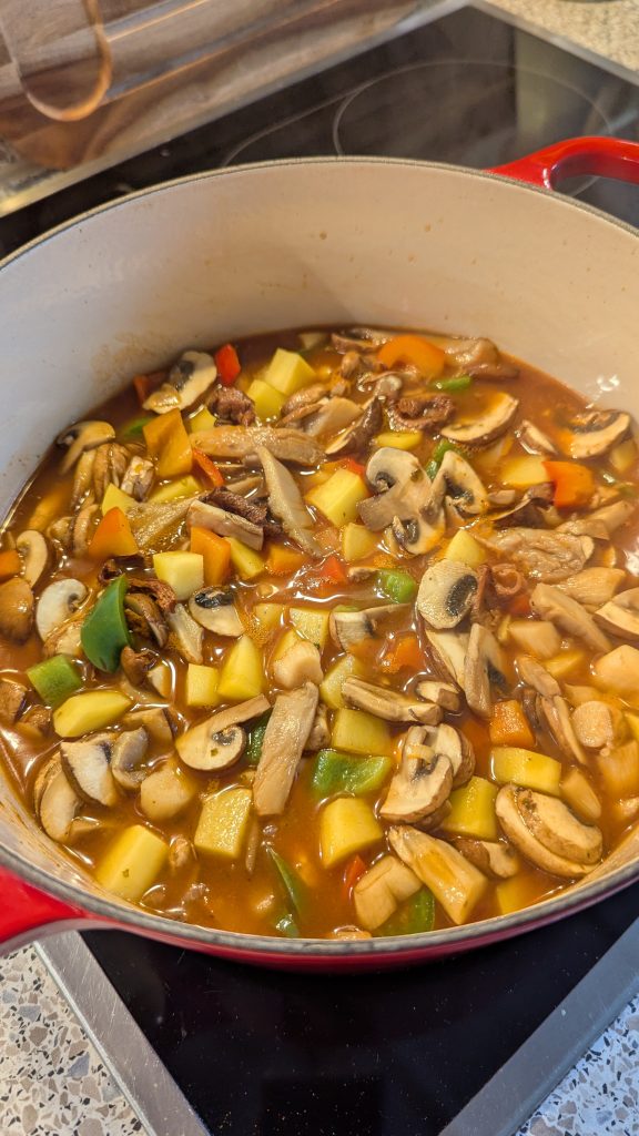 Alles bei mittlerer Hitze ca. 20–25 Minuten köcheln lassen, bis die Kartoffeln weich sind.