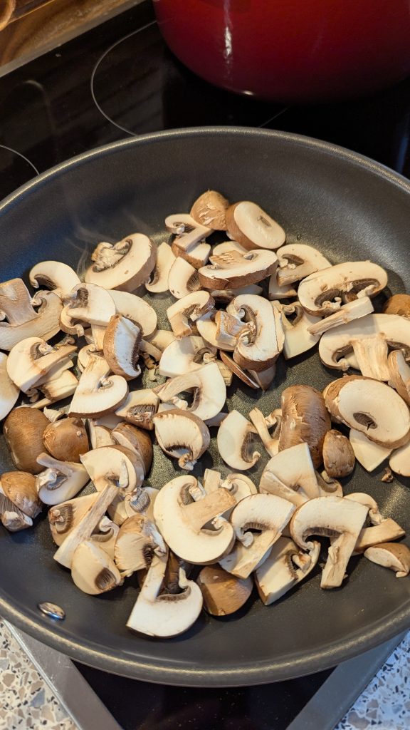 In einer Pfanne mit etwas Öl die Pilze bei hoher Hitze kräftig anbraten, bis sie Farbe bekommen und dann in den Topf geben.