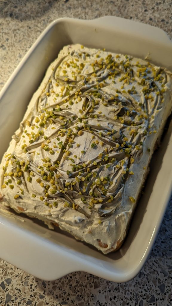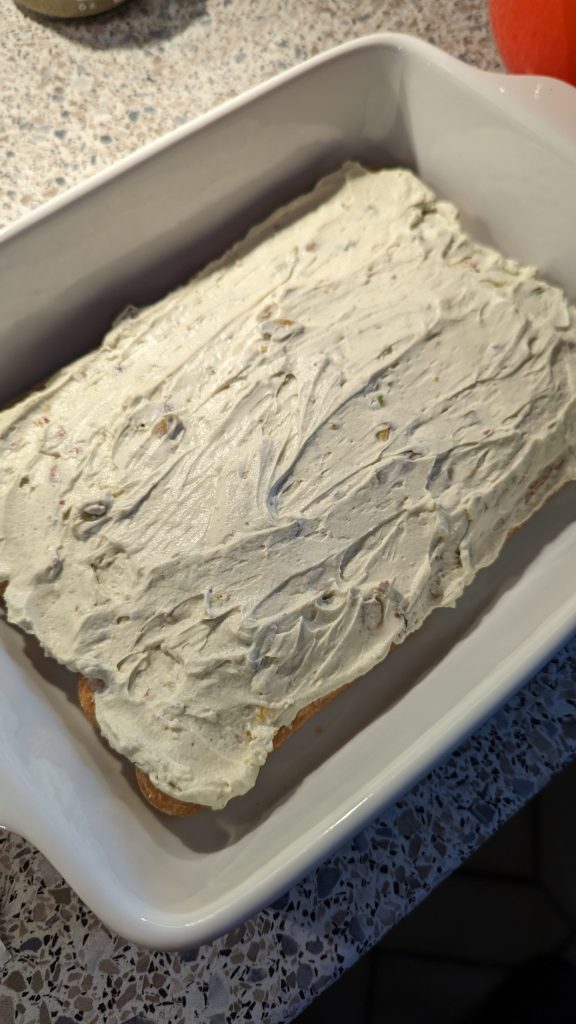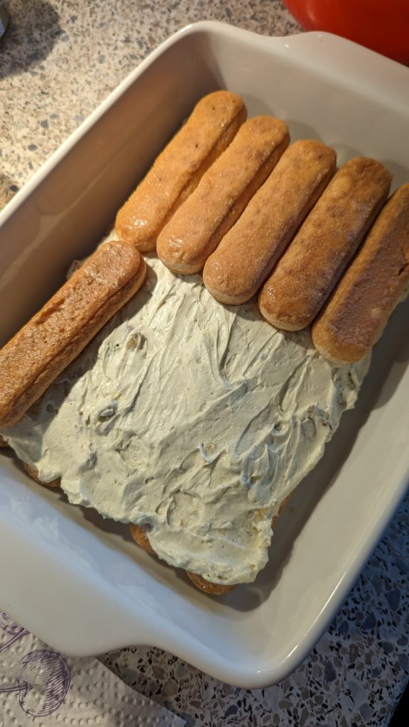 Den Espresso mit der Milch vermischen und die Löffelbiskuits darin eintauchen und in eine Form schichten. Die Hälfte der Creme darüber verteilen und wieder eine Schicht Biskuits. Die oberste Schicht mit Creme abschliessen und die restlichen gehackten Pistazien und ein Paar Kleckse der grünen Pistaziencreme aus dem Glas, als Deko darüber verteilen.