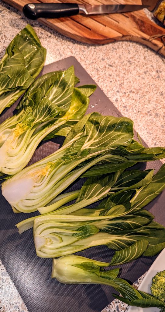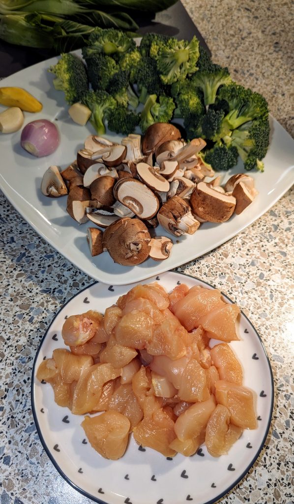 Hähnchenbrust oder Tofu in kleine Würfel schneiden, Pilze in Scheiben oder Viertel schneiden, Brokkoli in kleine Röschen zerkleinern, Pak Choi vierteln, oder achteln.
