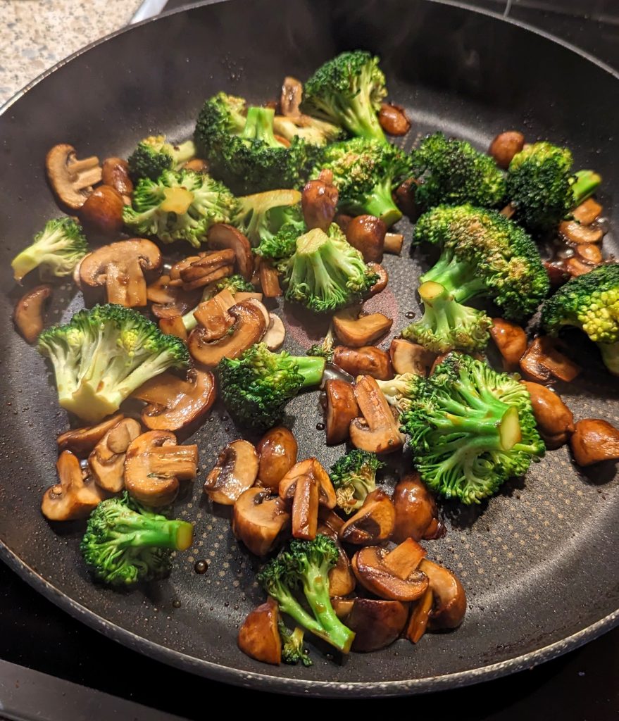 Sesamöl in eine Pfanne geben und erhitzen und Hähnchenbrust oder Tofu darin für 5-8 Minuten goldbraun anbraten. 2 EL Sojasauce darunter mischen und alles aus der Pfanne nehmen und beiseite stellen. In diese Pfanne 1 EL Sesamöl geben und darin Pilze und Brokkoli unter Rühren ca. 5 Minuten anbraten. Aus der Pfanne nehmen und beiseite stellen. 1 EL Sesamöl in die Pfanne geben und den Pak Choi darin langsam auf allen Seiten anbraten.