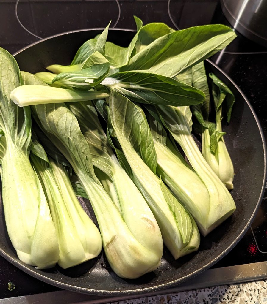 Gemüse und Fleisch/Tofu dazu geben und alles noch einmal erwärmen. In Tellern mit dem geschälten und halbiertem Ei und dem gebratenen Pak Choi anrichten.