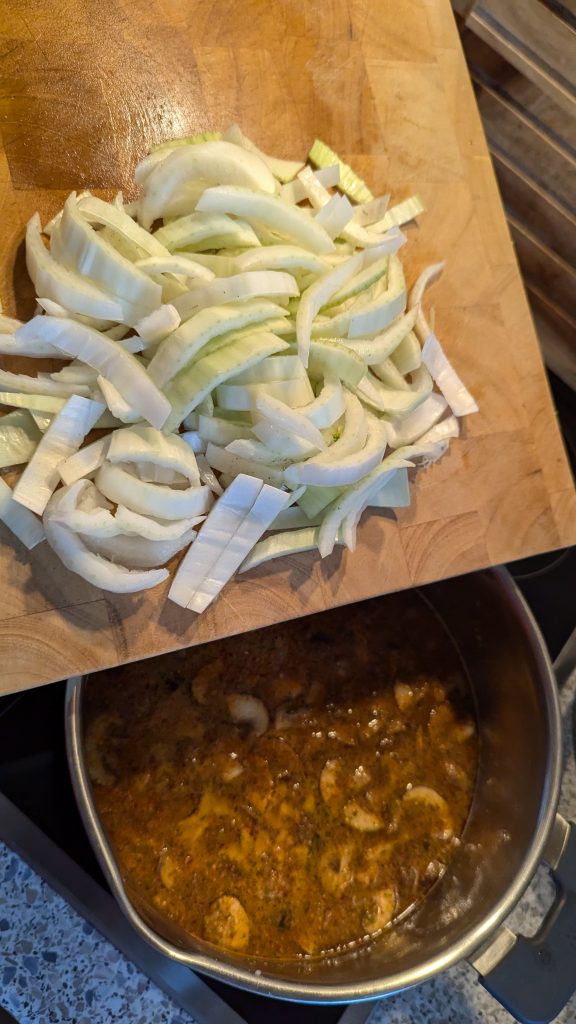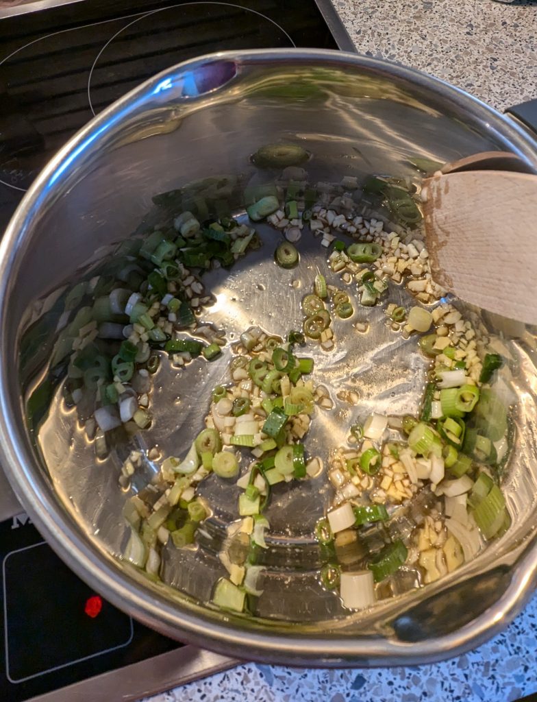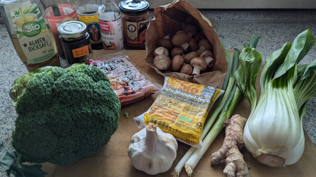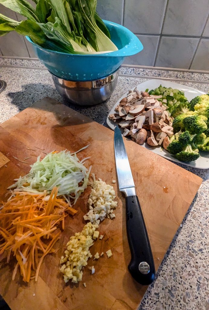 Frühlingszwiebeln in Ringe, Ingwer und Knoblauch in kleine Würfel, Pilze in Scheiben, Brokkoli in mundgerechte Stücke und den weißen Teil des Pak Choi in Streifen schneiden. Karotte und den Strunk des Brokkoli in feine Streifen hobeln. (machen wir mit dem Strunk immer so, da wir meist Bio Brokkoli haben)
