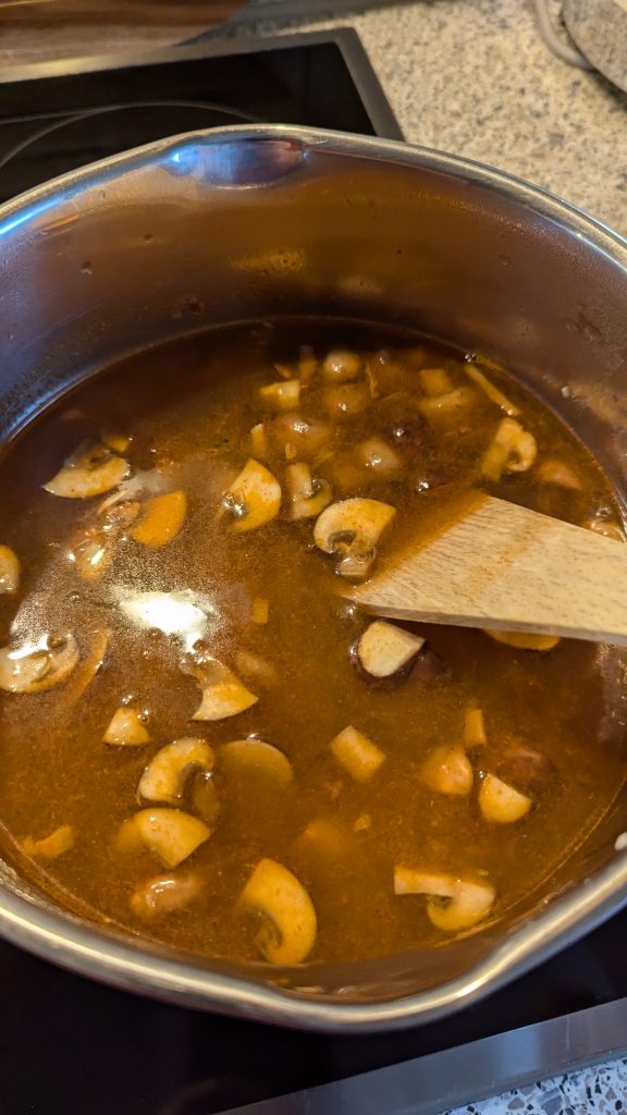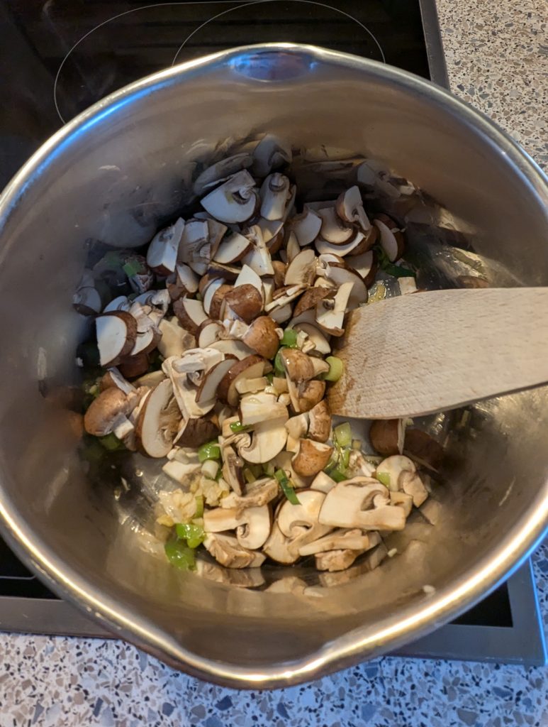 3 EL Sesamöl in einem Topf erhitzen. Knoblauch und Ingwer darin unter Rühren für 2 Minuten dünsten. Pilze dazugeben und weitere 2 Minuten anbraten.