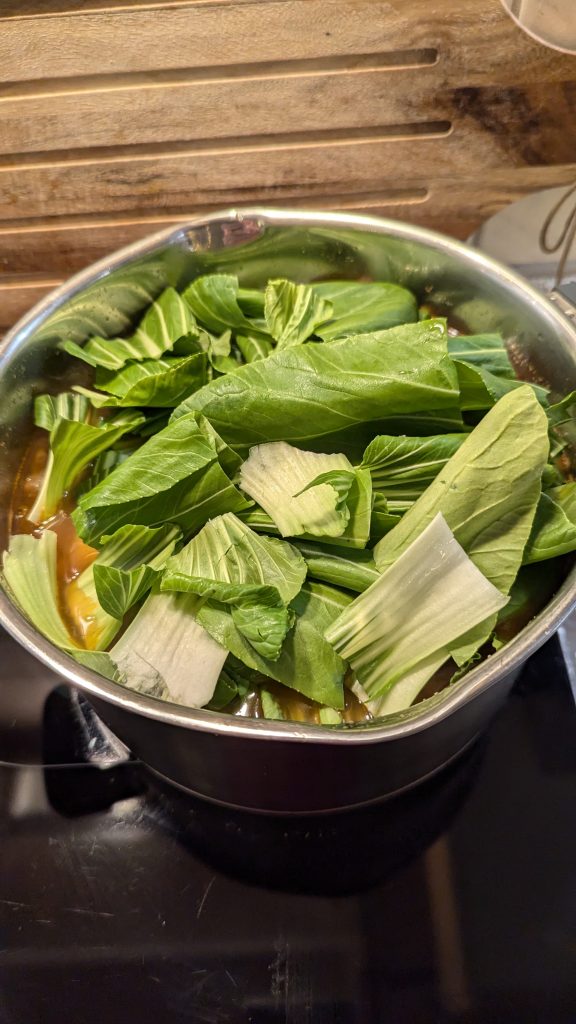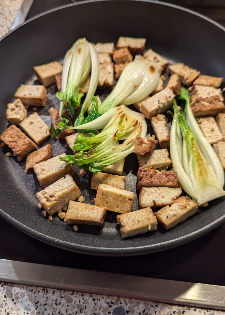 Den Tofu in Würfel schneiden und in einer Pfanne kurz anbraten. Den grünen Teil des Pak Choi und die Nudeln in die Suppe geben und alles kräftig abschmecken. Es soll kräftig würzig und sauer sein.