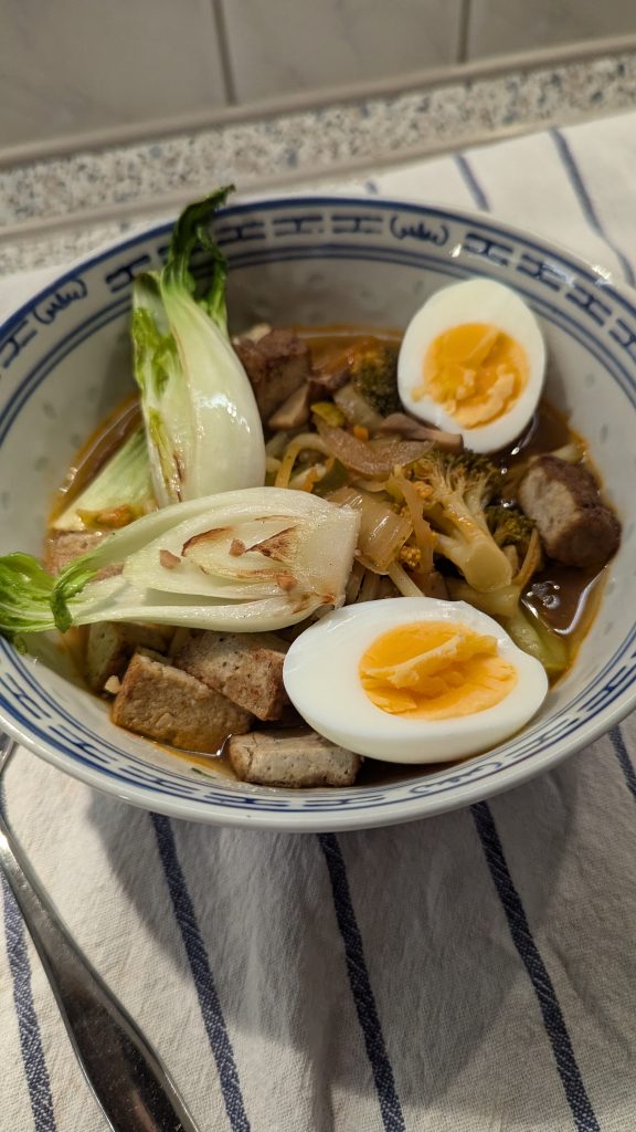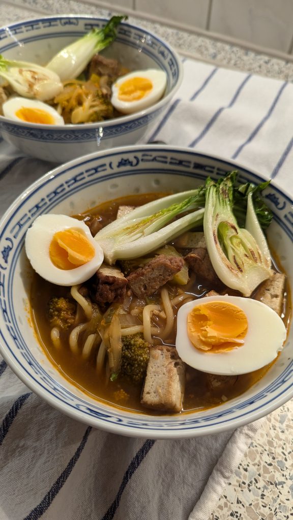 Hausgemachte Ramen-Suppe mit einer köstlichen Mischung aus umami-reichen Pilzen, zartem Pak Choi und würzigem Tofu. Die perfekte Balance zwischen herzhaft und frisch. Ein wärmendes Gericht für Körper und Seele.