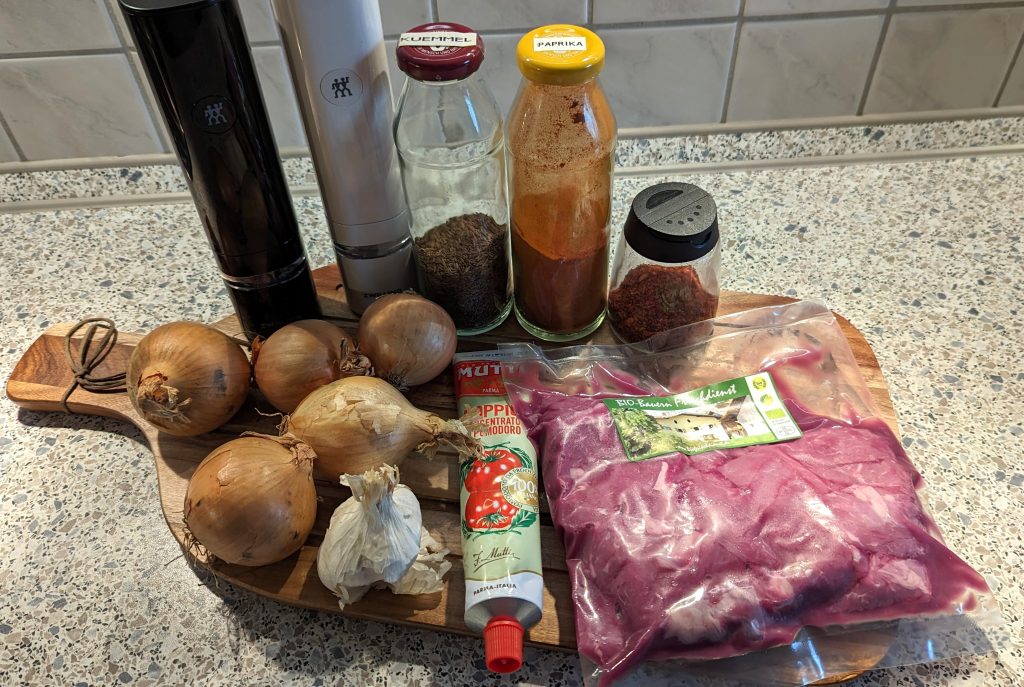 Knoblauch, Tomatenmark und Paprikapulver zufügen, gut durchmischen und kurz anbraten. Kümmel, Majoran, Chiliflocken, Salz, Pfeffer und Fleisch dazu um mit Gemüsebrühe aufgießen. Das Fleisch sollte knapp bedeckt sein.
