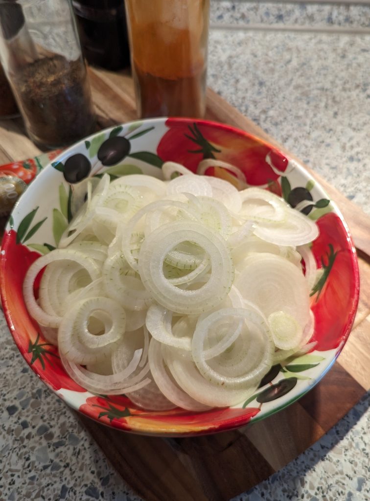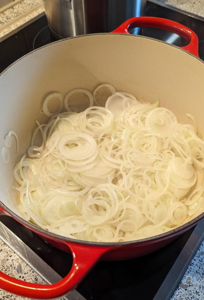 Zwiebeln schälen und in Ringe hobeln. Knoblauch schälen und klein würfeln. Öl in einem großen Topf erhitzen und die Zwiebeln darin ca. 10 Minuten glasig dünsten.