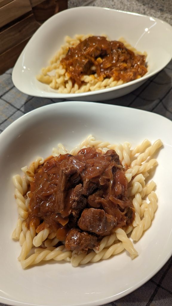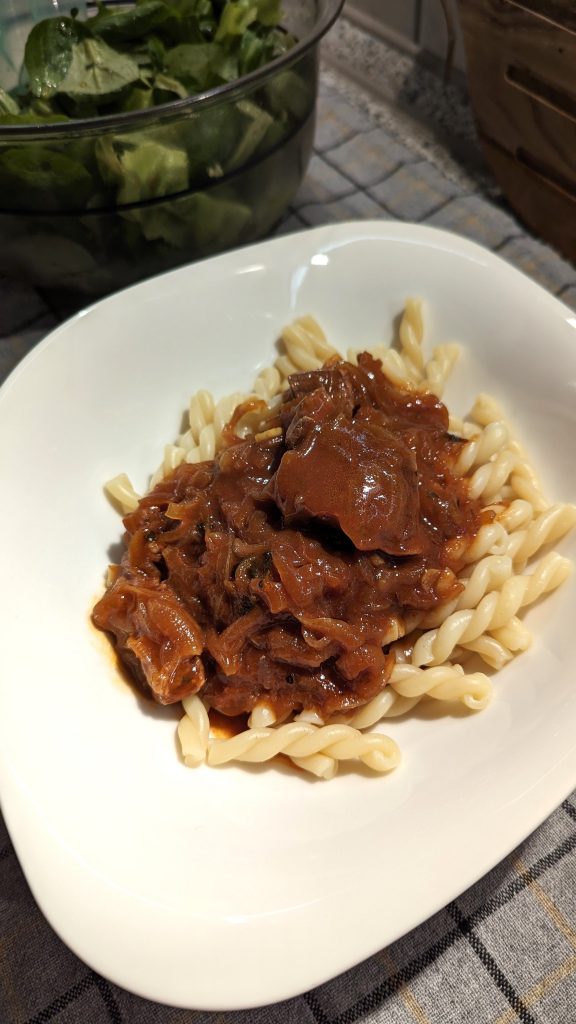 Zugedeckt bei 140° Ober/Unterhitze, in den Backofen. Am Schluss noch einmal mit Salz, Pfeffer und der Sojasoße abschmecken. Wer die Gulaschsoße etwas dicker möchte kann etwas aufgelöste Speisestärke unterrühren und noch einmal aufkochen lassen.