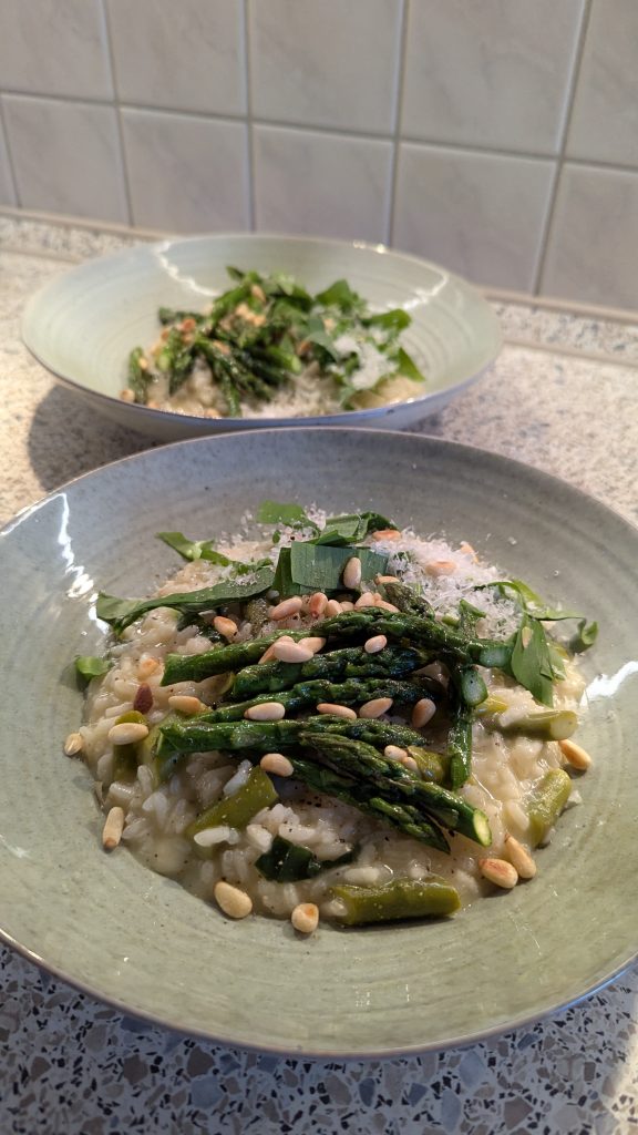 Optional können die Spargelspitzen kurz angebraten und über das Risotto gegeben werden.