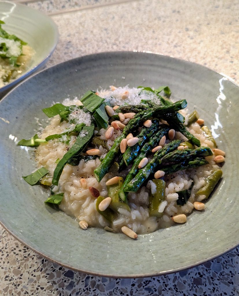 Etwa 5 Minuten bevor das Risotto fertig ist, die Spargelstücke hinzufügen und unterrühren. In den letzten 2-3 Minuten den gehackten Bärlauch hinzufügen und vorsichtig unterheben. Achte darauf, den Bärlauch nicht zu lange zu kochen, da er sonst an Aroma verliert.
