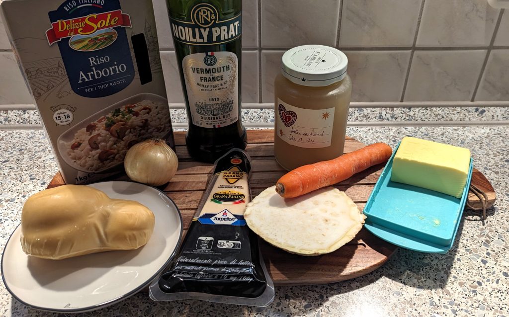 Zwiebel, Karotte und Sellerie in kleine Würfel schneiden. Öl in einem Topf erhitzen und das Gemüse darin ca. 3-4 Minuten unter Rühren dünsten. Reis zufügen und mit dem Gemüse zusammen rösten, bis der Reis vollständig von einem Fettfilm überzogen ist. Mit Noilly Prat/Weißwein ablöschen und weiter Rühren, bis dieser vollständig eingekocht ist.