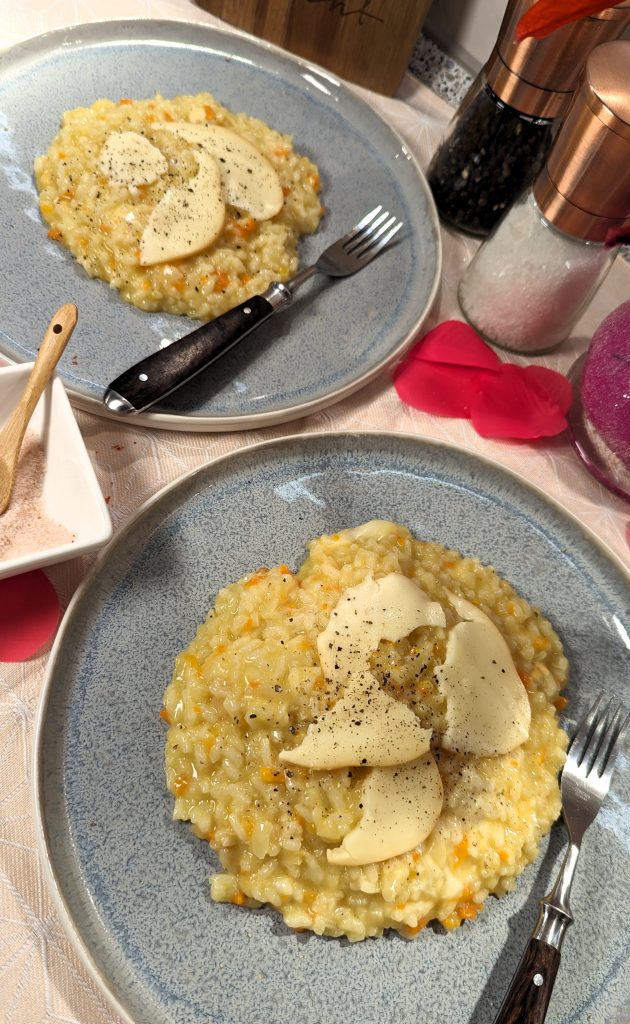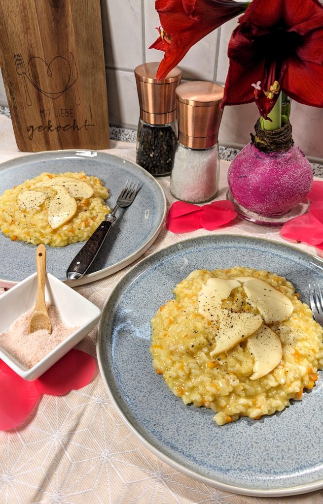 Scamorza in Scheiben schneiden und auf dem Risotto anrichten. Der Käse sollte sanft ins Risotto schmelzen.